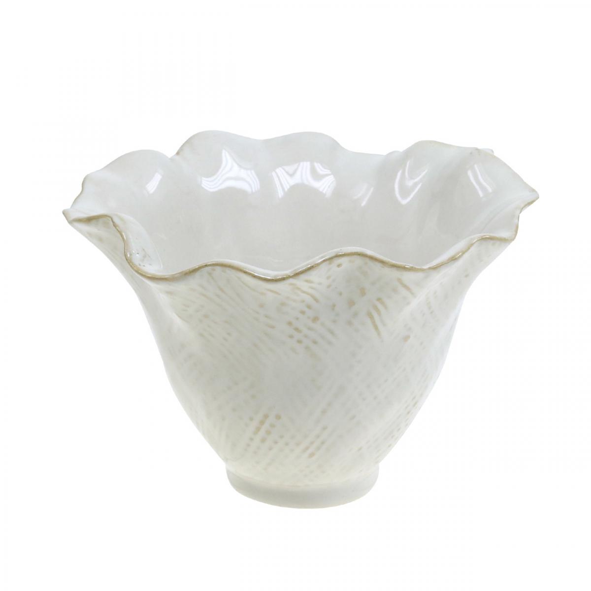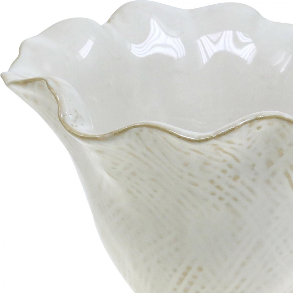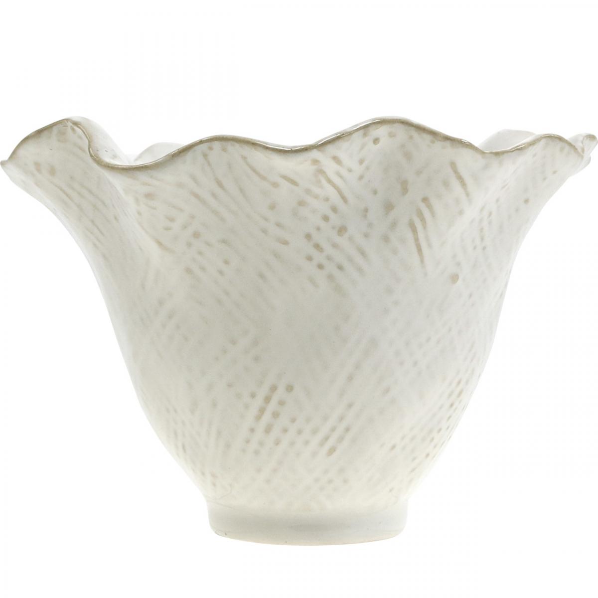 A white ceramic flower pot with an artistic finish. This planter in the shape of a calyx offers space for your favorite little plants.The plant pot has the shape of a flower opening upwards and stands on a small round foot. The edge of the curved flower shape is painted in a subtle beige. The outer wall of the flower pot is decorated with white hatching and beige accents. Thanks to the small foam nubs on the bottom, the ceramic vase can also be placed on sensitive furniture surfaces such as glass or wood without leaving scratches or marks.