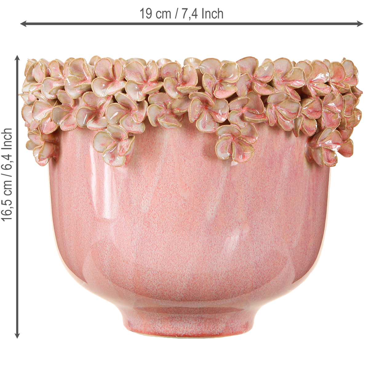 Add a touch of vintage charm to your home with our ceramic flower rim flower pot in pink. Perfect for spring and summer decoration, this beautiful planter impresses with its unique glazed pink surface and detailed flower rim that gently reflects the light. The color changes elegantly from pink to old pink, interrupted by delicate green-brown accents. White accents can also be seen occasionally on the flower pot. These subtle nuances together with the romantic flower pattern make this flower pot an ideal element for vintage or shabby chic arrangements. The shape of the flower pot tapers near the bottom to create an elegant base for additional stability and style. Be inspired by the beauty of this decorative element to embellish your living spaces in a distinctive and stylish way. The plant pot is perfect for your living room, as a table decoration in summer or spring or as a stylish gift idea.