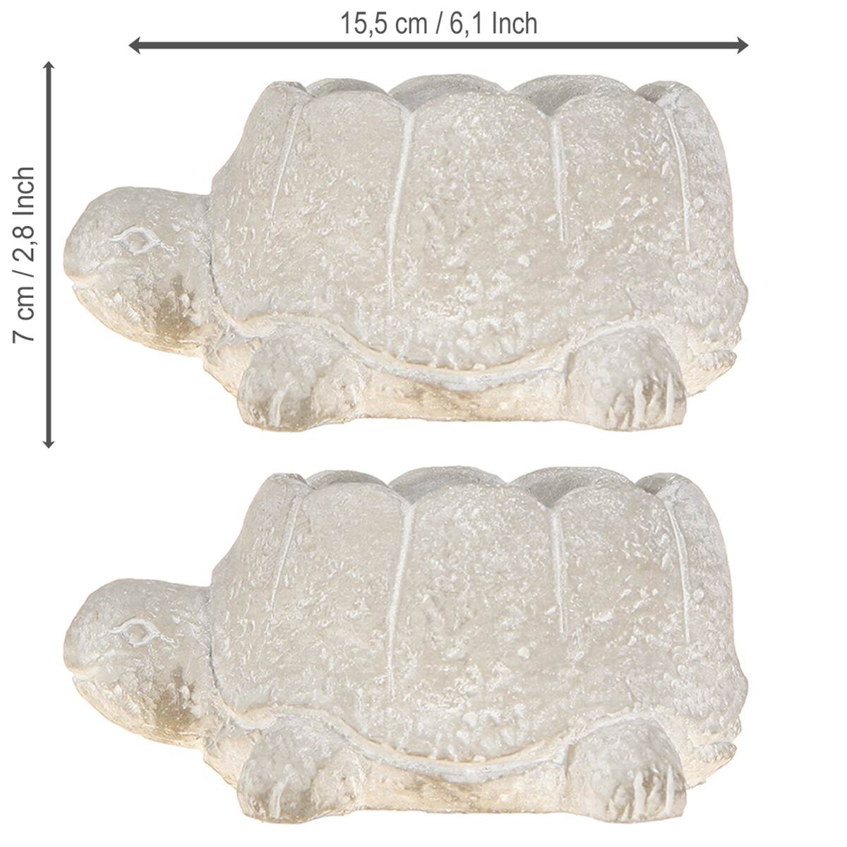Discover the variety of creative garden decorations with our unique turtle-shaped flowerpot. This charming concrete figure fits perfectly into any garden or living environment and adds a seasonal accent, especially on tables. With its gray-and-white, washed surface, this decorative figure embodies the popular shabby chic style, which brings a breath of fresh air both in spring and summer. The fine details, such as the turtle's lovingly sculpted little feet, give this decoration a lively appeal. The purchase decision will be easy, as the set includes two flowerpots, offering creative possibilities for balcony arrangements, windowsill decorations, and kitchen table decorations. Our turtle flowerpot also makes a perfect gift for garden lovers and those who would like to become one. At Floristik24, you'll find other matching decorative items that emphasize your personal style and harmonize perfectly with this product. Let your creativity run wild and transform your home into a green oasis of well-being!