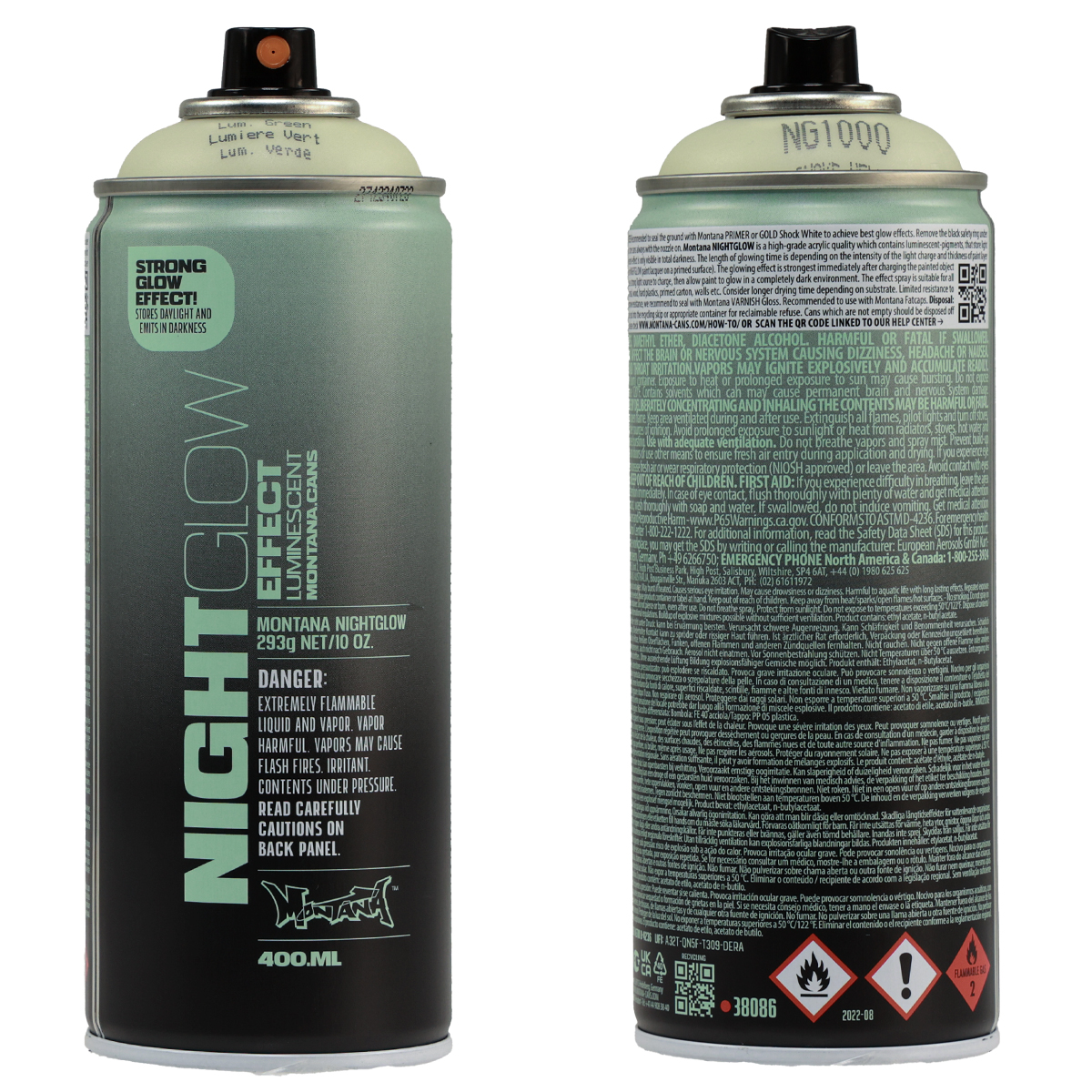 The fluorescent color Nightglow as an effect spray from Montana Cans has an eerily beautiful green tone, but the fluorescent color is also available in orange in our shop.