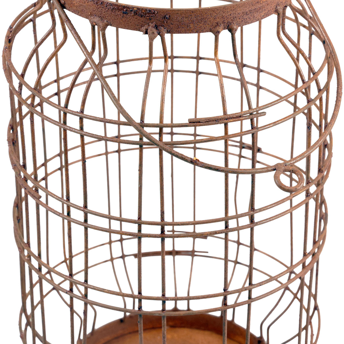 The shape is reminiscent of a birdcage without a roof. The open decorative lantern has a movable handle with which you can carry the metal decoration.