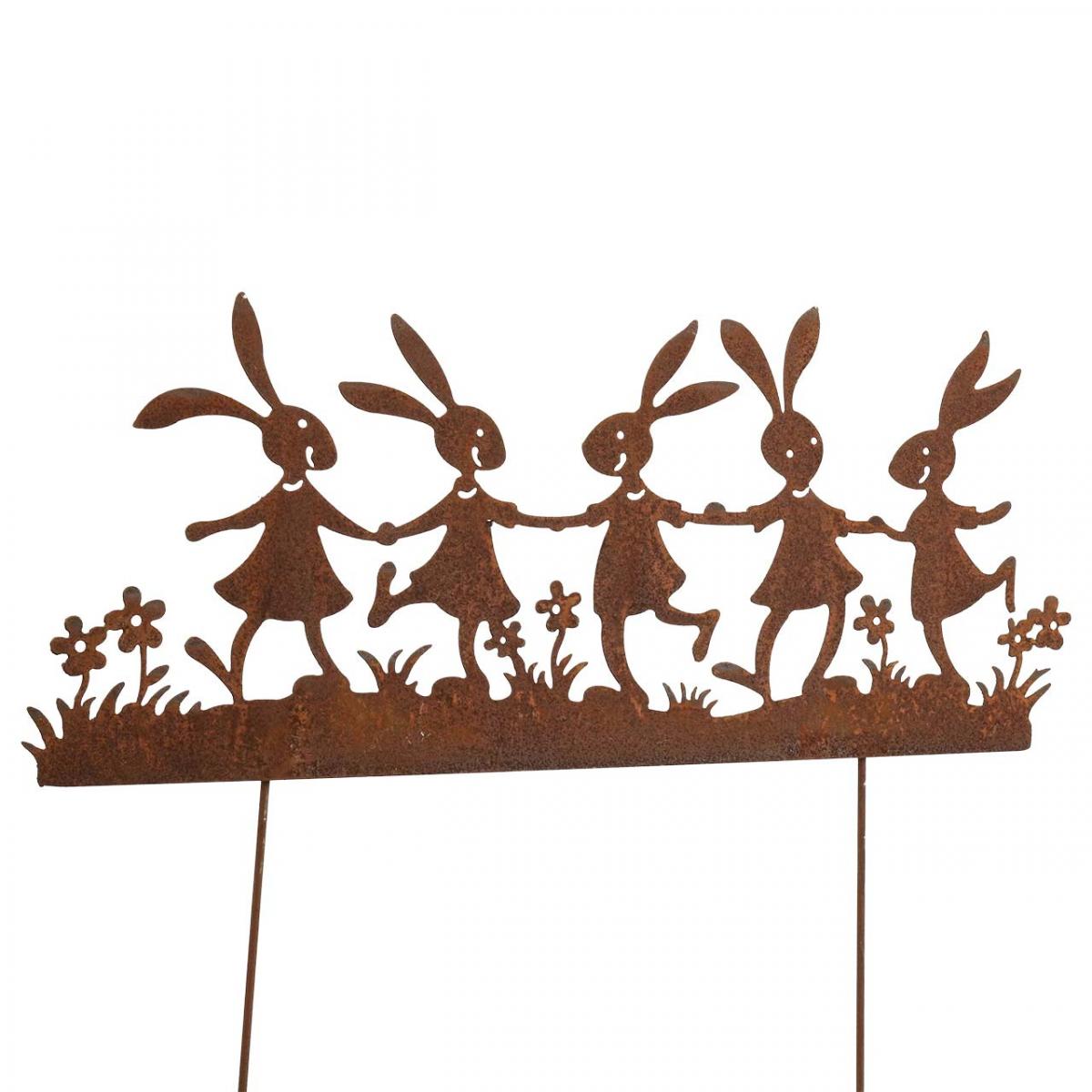 Five rabbits open the Easter spring dance on this metal flower plug. The rust garden stake brings rustic charm to your Easter decorations.The flower plug for outdoors can be used as a bed decoration or as an Easter decoration in plantings in a bucket or flower basket. Even larger arrangements for the entrance area or in the shop window can be wonderfully decorated with the garden stake with rust decor.