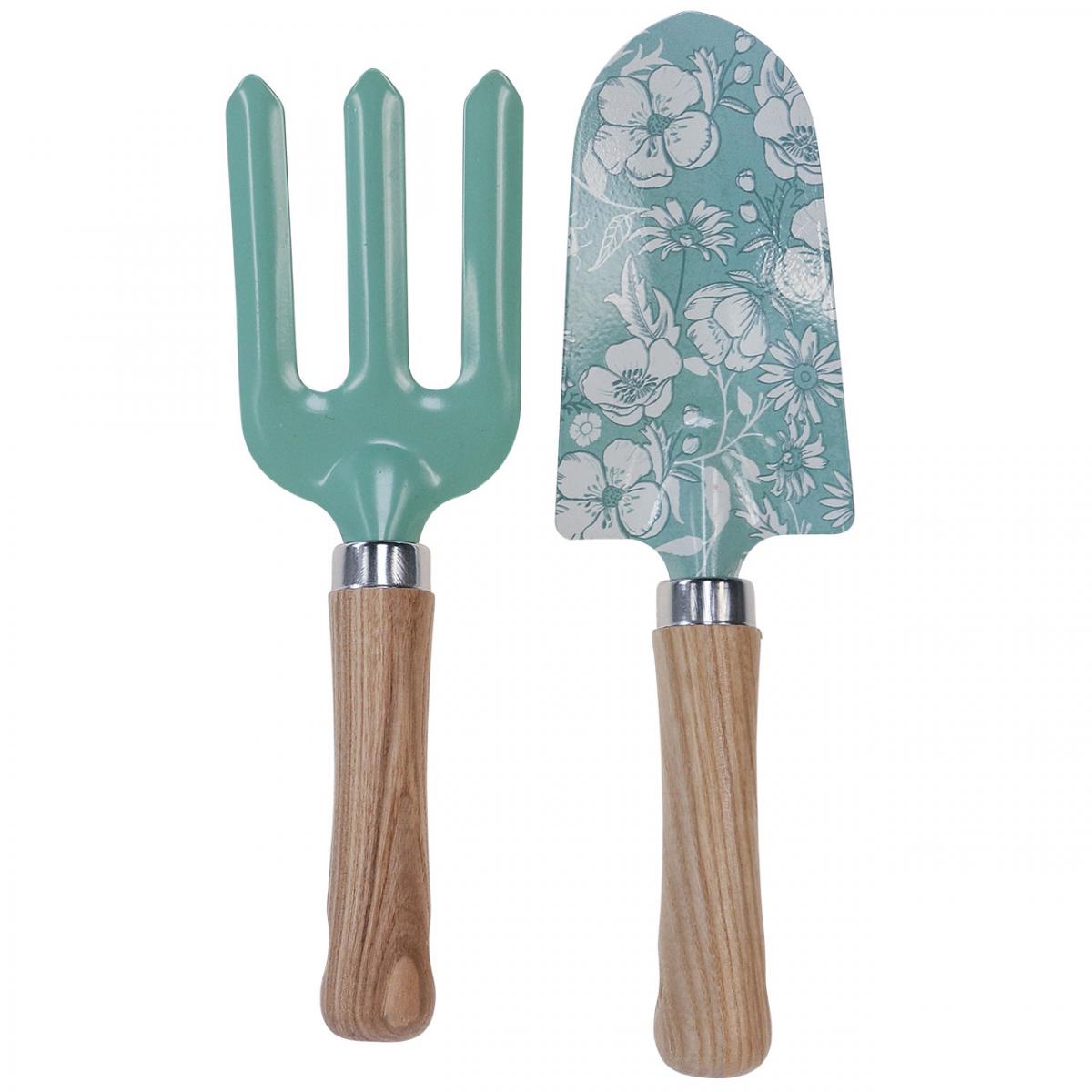 Both garden tools have shapely wooden handles that clearly show the natural grain. Shovel and rake are made of metal and coated with a fine layer of paint in mint green. The shovel blade is also decorated with cream-colored motifs of flowers and leaves.