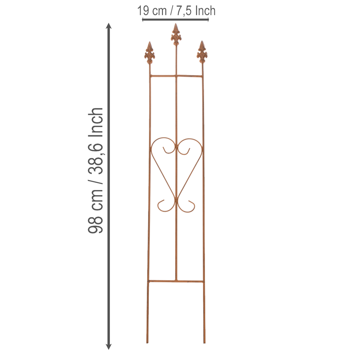 Why settle for just functionality when it can be beautiful too? Our garden trellis is decoratively designed in a heart shape, combining functionality with aesthetics. With its gently curved heart shape, it brings romance and playfulness to any garden. It not only provides support for climbing plants like roses and ivy, but also transforms even simple flowerbeds or planters into a visual delight. The weathered steel finish gives it a rustic, natural charm that blends perfectly with country-style or classic garden designs. Whether used as a support for romantic roses or as a decorative element on the balcony, this trellis offers countless possibilities.