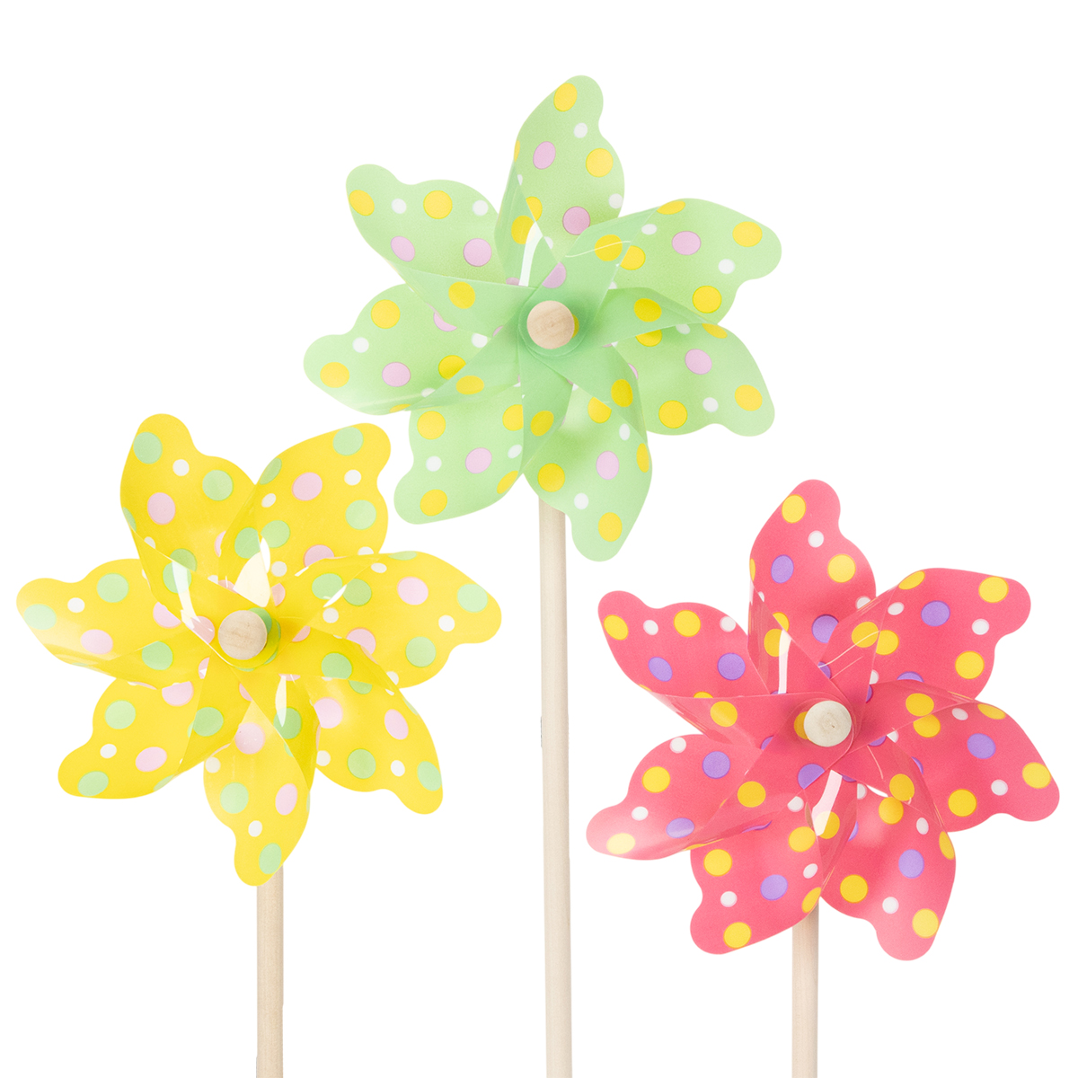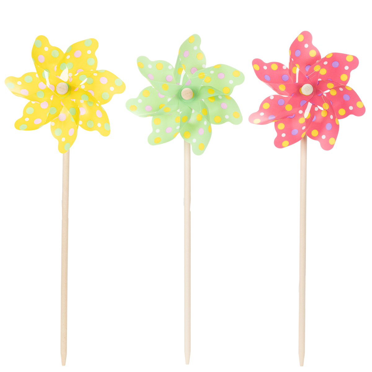 With a total height of 47 cm and a diameter of 17 cm, these windmills are perfectly proportioned for placement among flowers and plants. The robust plastic material combined with a sturdy wooden stake ensures durability. And best of all: you receive a set of three, so you can let your creativity run wild.
