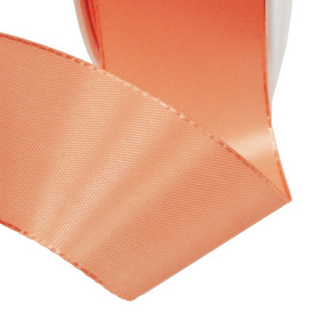 The apricot gift and decoration ribbon is approximately 25 millimeters wide and about 50 meters long. It is made of 100% polyester and is wound on a plastic spool.