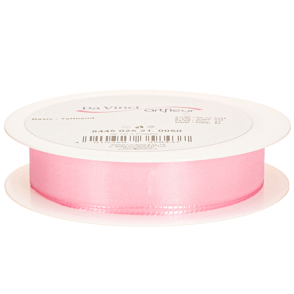 The light pink gift and decoration ribbon is approximately 25 millimeters wide and approximately 50 meters long. It is made of 100% polyester and wound on a handy plastic spool.