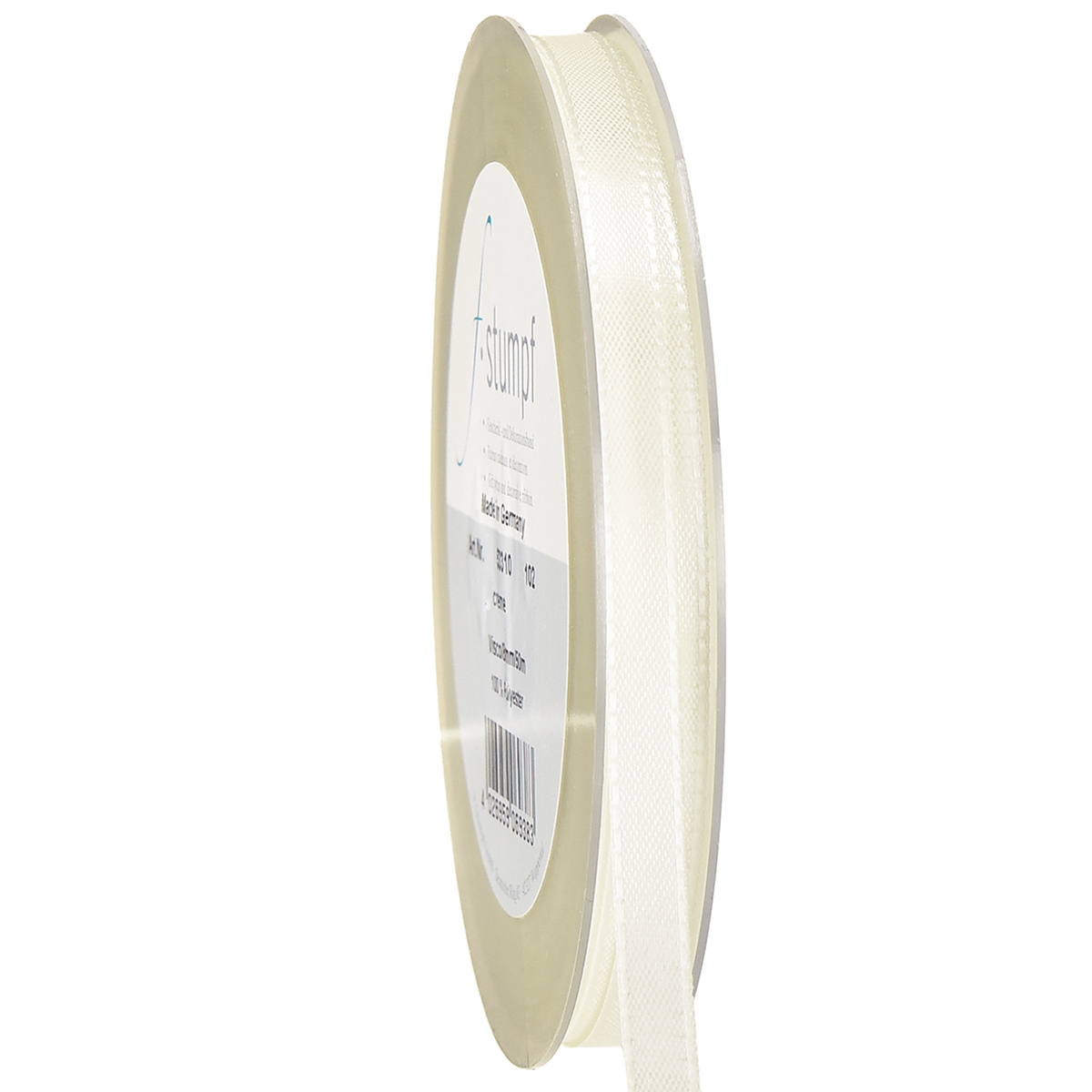 The cream-colored gift and decoration ribbon measures around 8 millimeters in width and around 50 meters in length. It consists of 100% polyamide and is rolled up on a plastic spool.