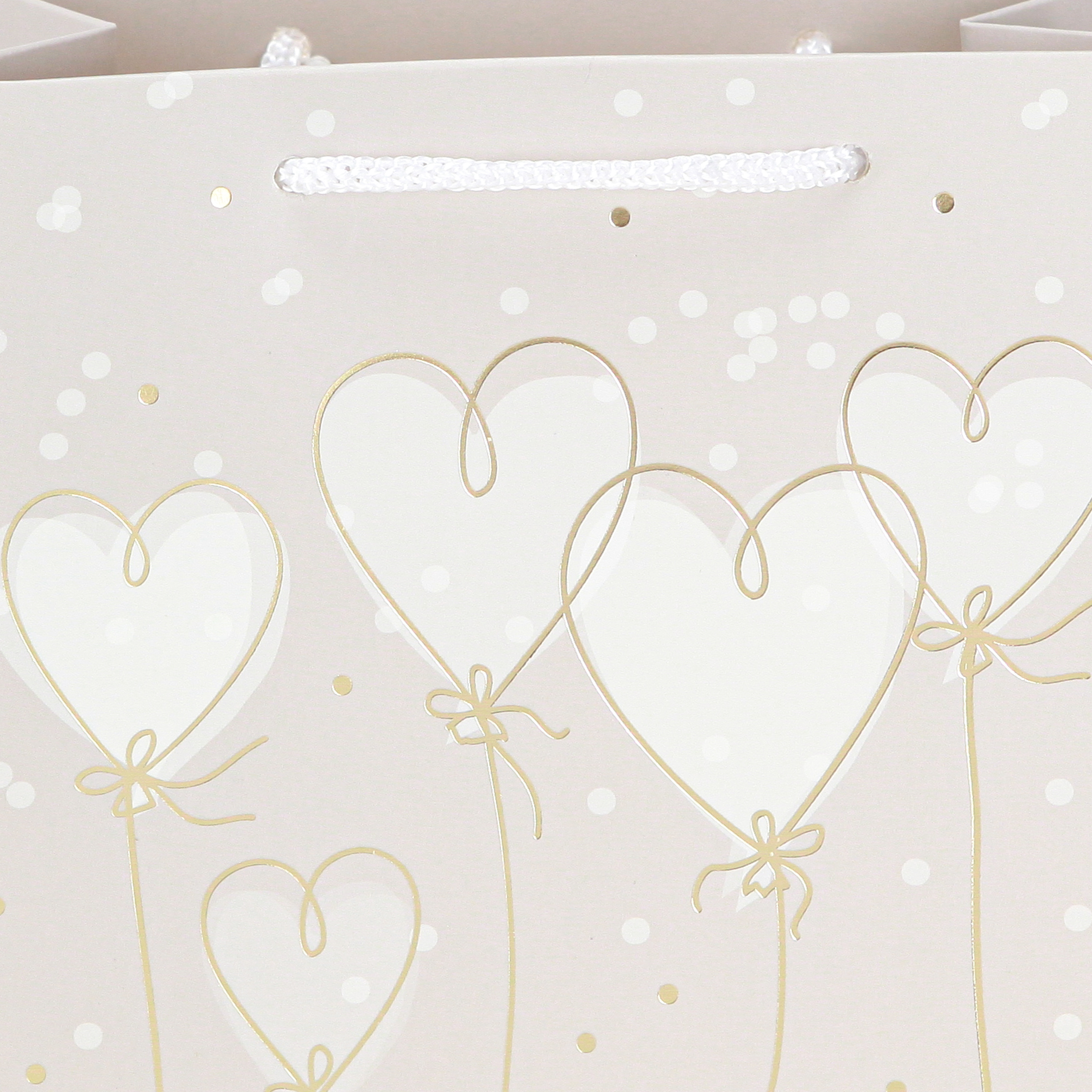 This stylish "Just Married" gift bag in beige offers the ideal packaging solution for wedding gifts. It combines elegance and functionality, allowing you to present your gifts stylishly and securely. Featuring a design featuring white heart-shaped balloons and gold lettering, this gift bag embodies everything that makes romantic wedding celebrations so special, while also having a timelessly modern feel. Measuring approximately 18 x 10 x 23 cm, it's large enough to safely store even larger gifts. The sturdy white textile drawstrings and reinforced base guarantee stability and durability. This gift bag isn't just packaging; it's a stylish accessory that elegantly enhances the celebrations. Whether used as a centerpiece for the gift table or as a gift carrier, this bag is a top-notch choice for anyone who appreciates the finest details.