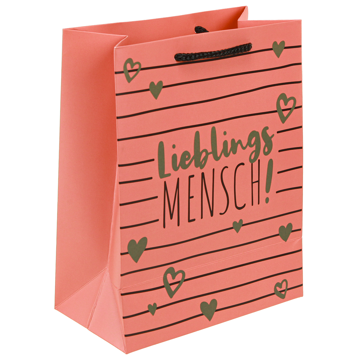 Our stylish gift bag with hearts is the ideal choice for lovingly wrapping your presents. The fresh coral-red background, decorated with green hearts and the heartfelt inscription "Favorite Person," lends each present a personal touch. This robust paper gift bag impresses not only with its charming design but also with its high-quality workmanship. The sturdy handles made of black textile cord ensure comfortable handling and round off the elegant appearance. Whether for birthday presents, small surprises, or as romantic gift wrapping – this gift bag is versatile and therefore perfect for any occasion. Its coated paper and reinforced base guarantee stability and durability. Use this carrier bag to skillfully showcase your gifts and give them an exclusive presentation.