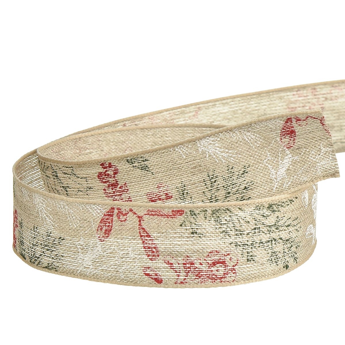 Our decorative ribbon in a natural-looking country house style combines traditional Christmas elements with modern elegance. The natural linen is printed with fir branches and holly leaves and decorated with red berries. The decorative ribbon is perfect for those who value naturalness and a warm, inviting atmosphere in their holiday decorations. The dimensionally stable wire edge makes it easy to shape and attach for your decoration projects.