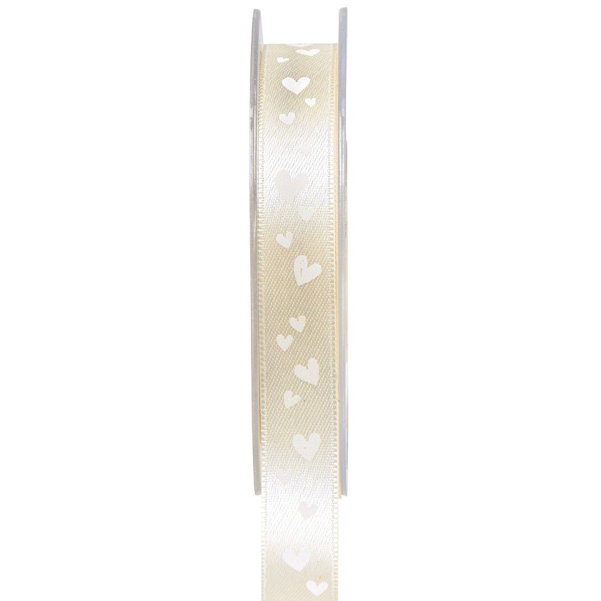The narrow gift ribbon has a silky sheen and is printed with white hearts that stand out delicately against the cream-colored fabric. The high quality of the romantic decorative ribbon is also reflected in the selvedges, which make it impossible to fray and stylishly finish the ribbon.
