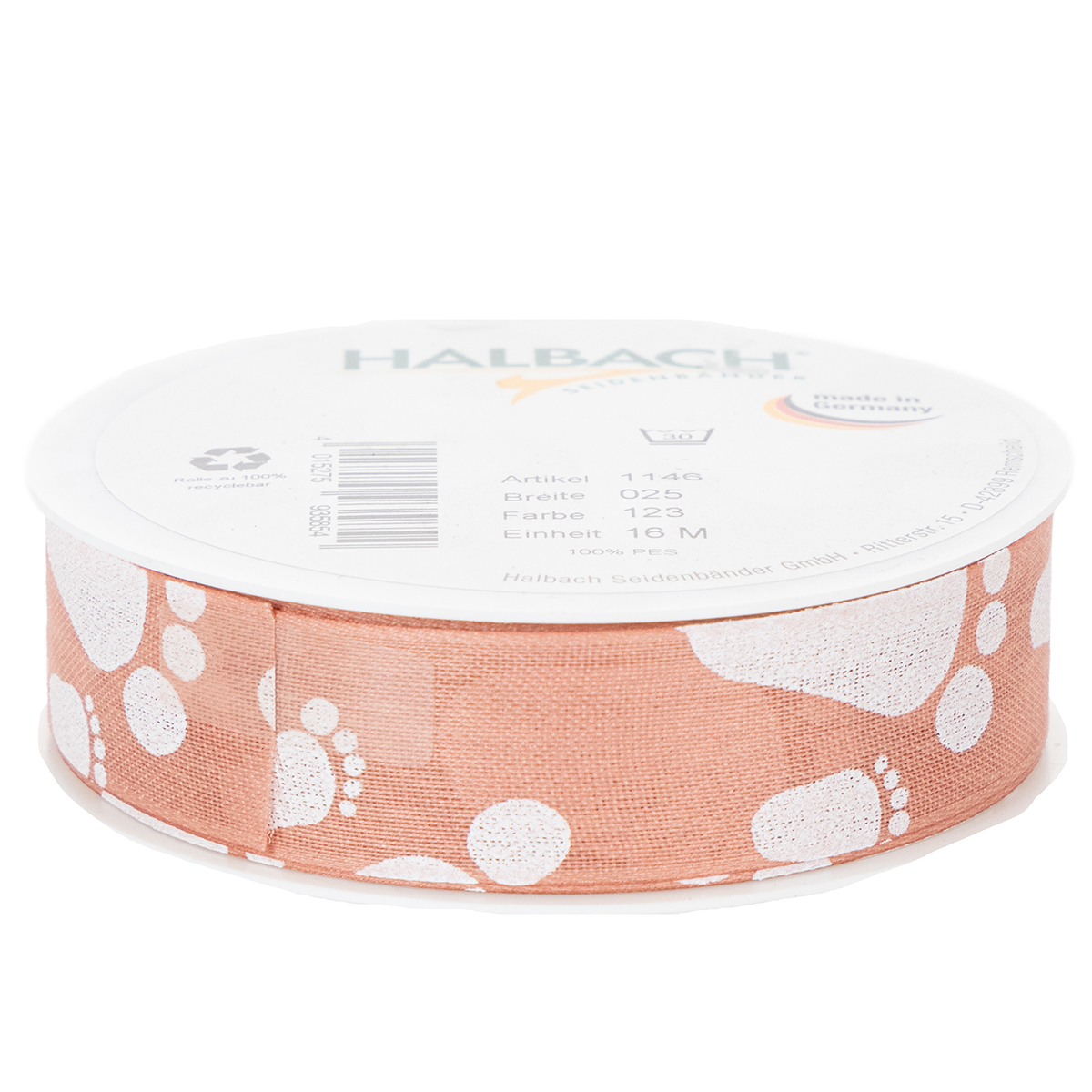 The gift ribbon with the baby feet is a high-quality plastic ribbon that is made in Germany. The silk ribbon is machine washable up to 30°C. Selved edges prevent the band from fraying.