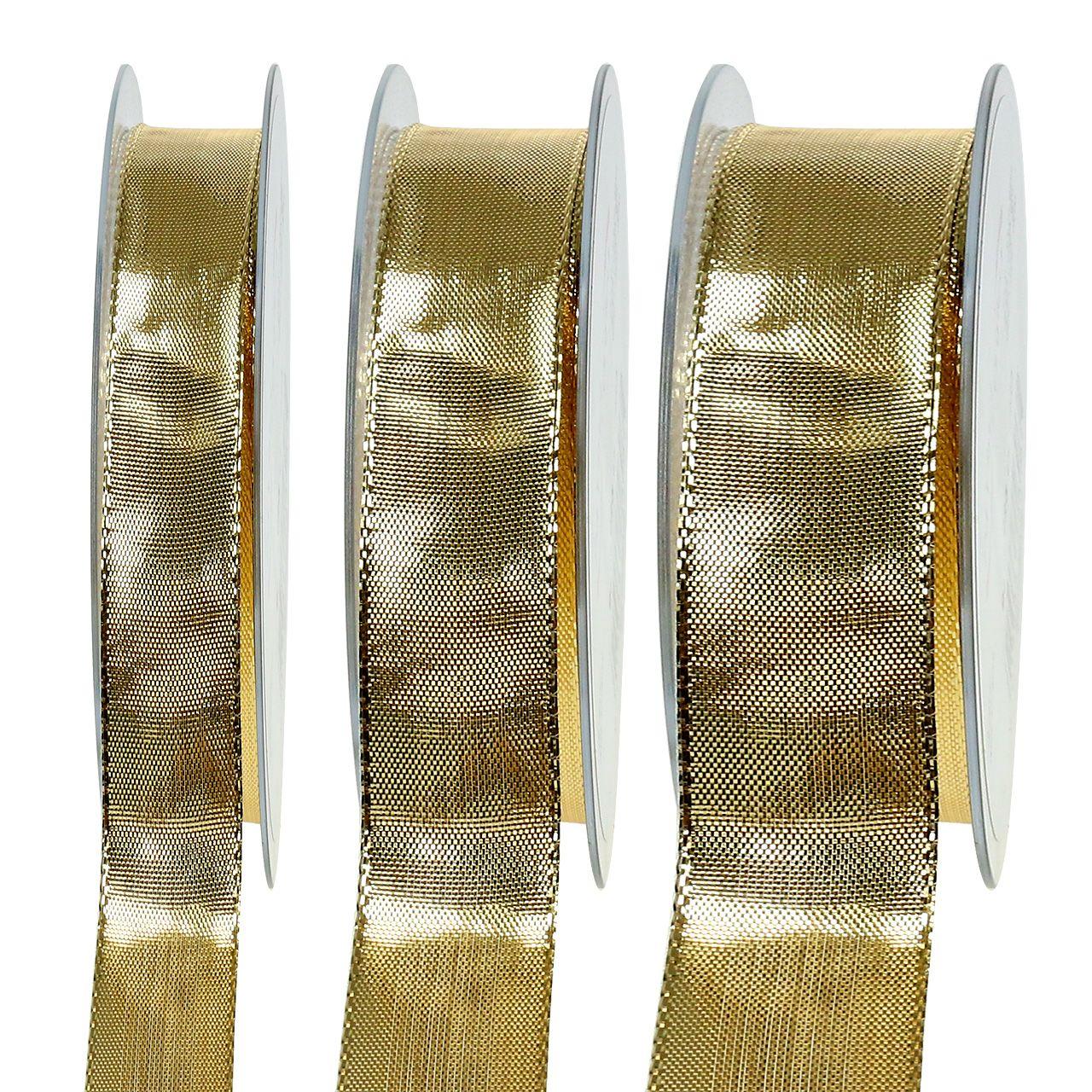 Be it at Christmas time, on the occasion of a birthday party, a golden wedding or a marriage: With this gift ribbon in gold with wire edge, which can be selected in different widths via the tab at the top right, presents large and small get that certain something! The bows that you tie from the shiny ribbon are, thanks to the edges reinforced with metal wire, much more dimensionally stable than with any ordinary satin ribbon, so that they can also be used for various decorative projects.
