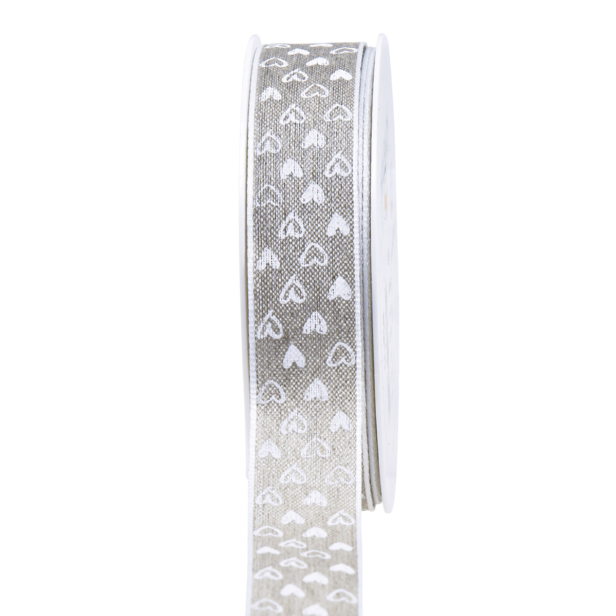 Various small hearts cover the gift ribbon with a romantic pattern. The white hearts are precisely printed on the high-quality beige ribbon. White selvedges stylishly frame the decorative ribbon.