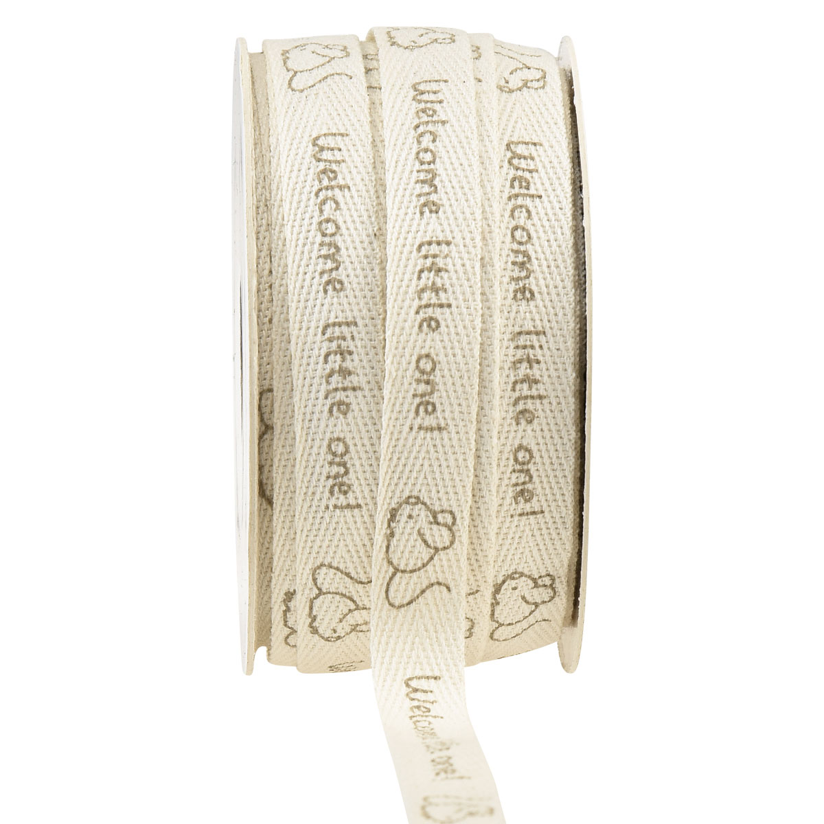Curious mice and the greeting “Welcome little one!” are printed in light brown on the cream-colored band made of pure cotton. The decorative ribbon made from the natural material cotton is biodegradable and is on a cardboard spool for more sustainability. This means that the baptism decoration does not require any plastic.