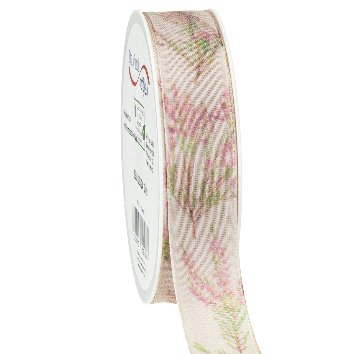 On a slightly transparent white background with a touch of pink, the heather (Erika) is shown as a flowering shrub. The decorative ribbon has a dimensionally stable selvedge. This means that the ribbon cannot fray at the edge and has optimal packaging and decorating properties.