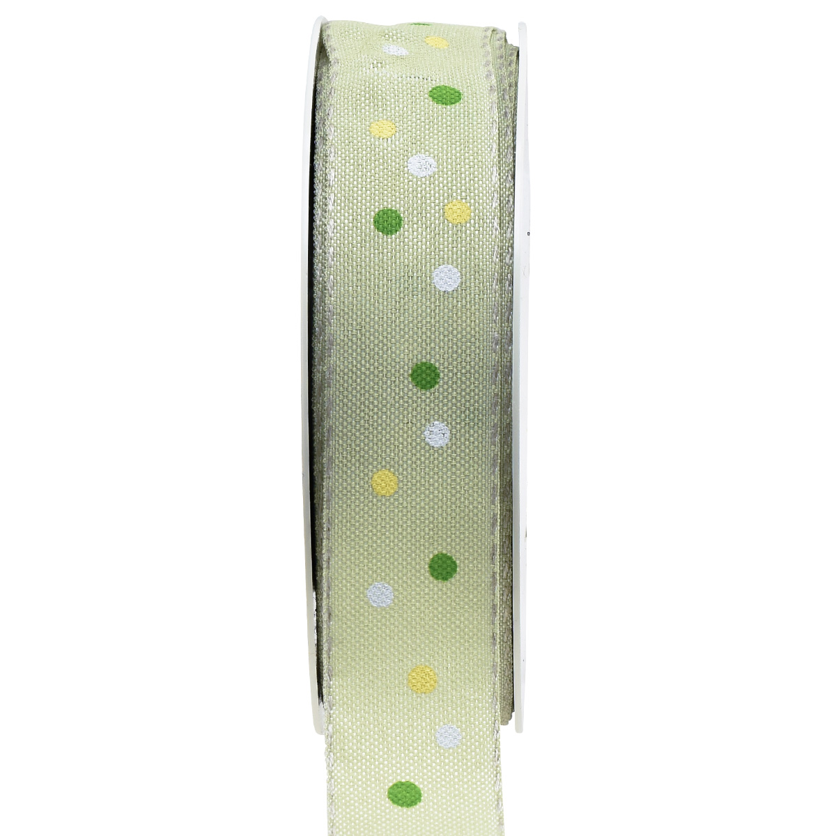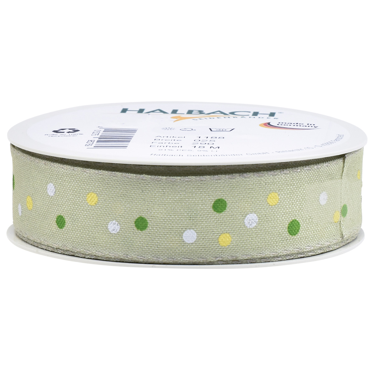 The dots in yellow, white and dark green are printed on the band in a loose, dancing pattern. An ideal color combination for the decorative ribbon on the light green background. Finally, sewn edges made of linen thread refine the fabric band. This makes the band look even more high-quality!