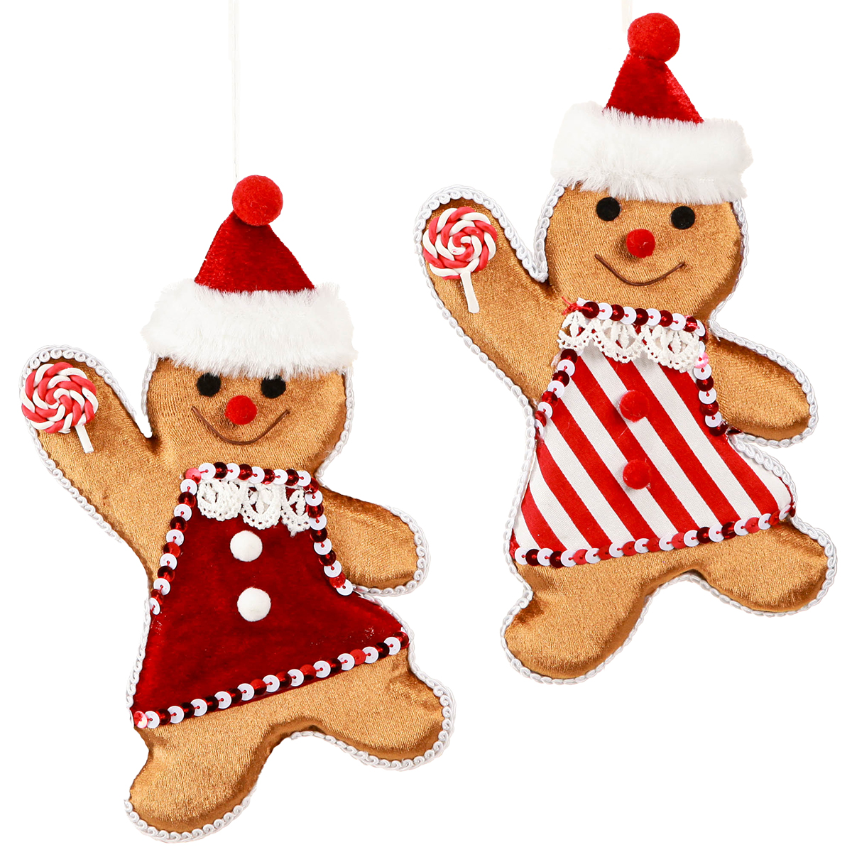 Bring a touch of traditional Christmas magic into your home with our gingerbread man pendants. This adorable decoration consists of two smiling brown gingerbread men that enchant with their charming design. The details are lovingly designed: a dress in velvety red and a red and white striped dress, both decorated with fine sequins. In their raised hands, the gingerbread men hold cute little sugar sticks that underline their festive charisma. The white decoration on the edges is reminiscent of icing. Their red hats with fluffy white trim complete the picture perfectly. This decoration fits wonderfully into a classic Christmas decoration and is ideal for decorating your Christmas tree or a beautiful door wreath. The detailed design makes these pendants an eye-catcher in every room.