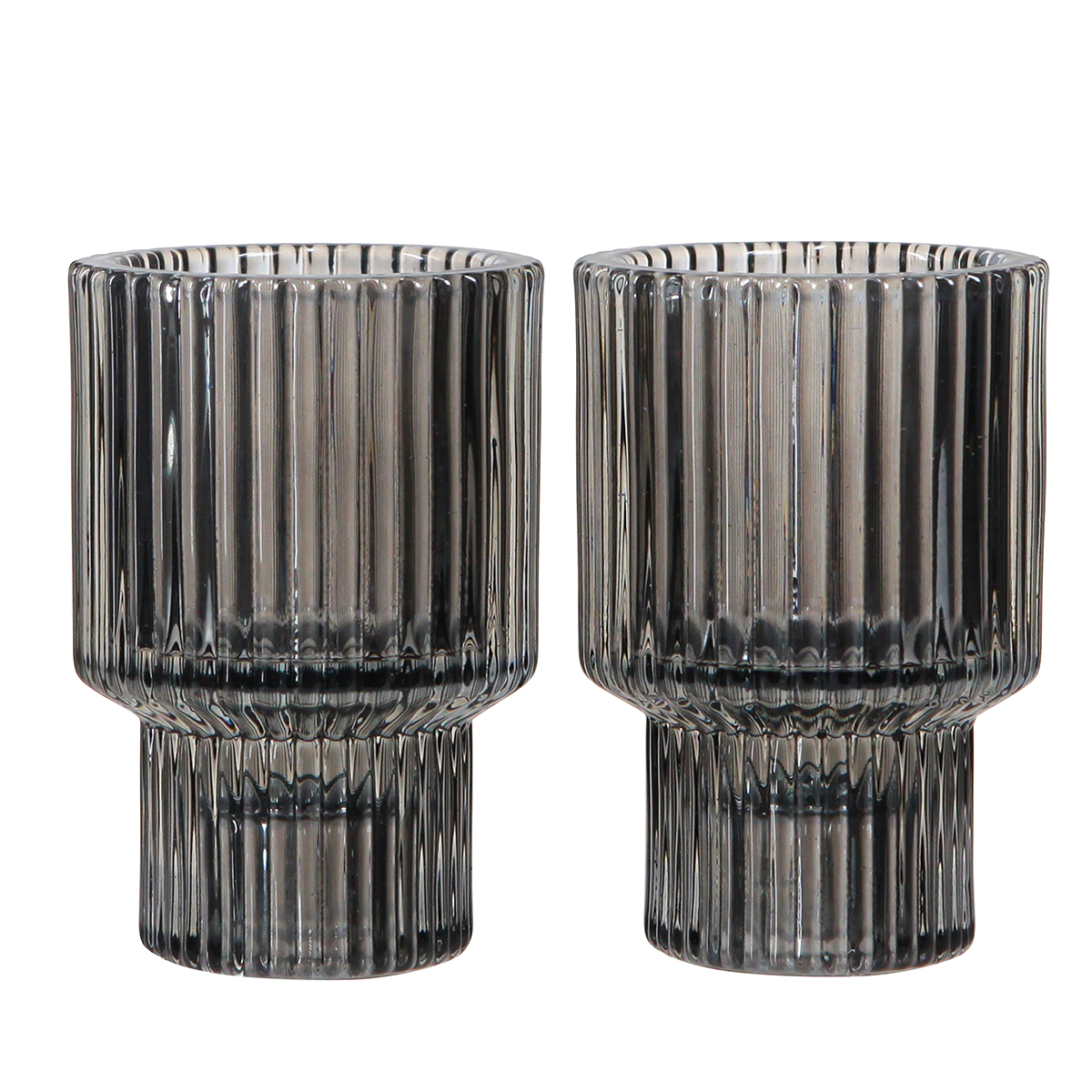 The grey glass candle holders impress with their timeless elegance and versatility. With their slim and sophisticated design, they fit perfectly into various interior styles such as retro, modern or classic. The tinted glass of the candle holders reveals its exclusive character at first glance, while the grooved sides create an interesting play of light.