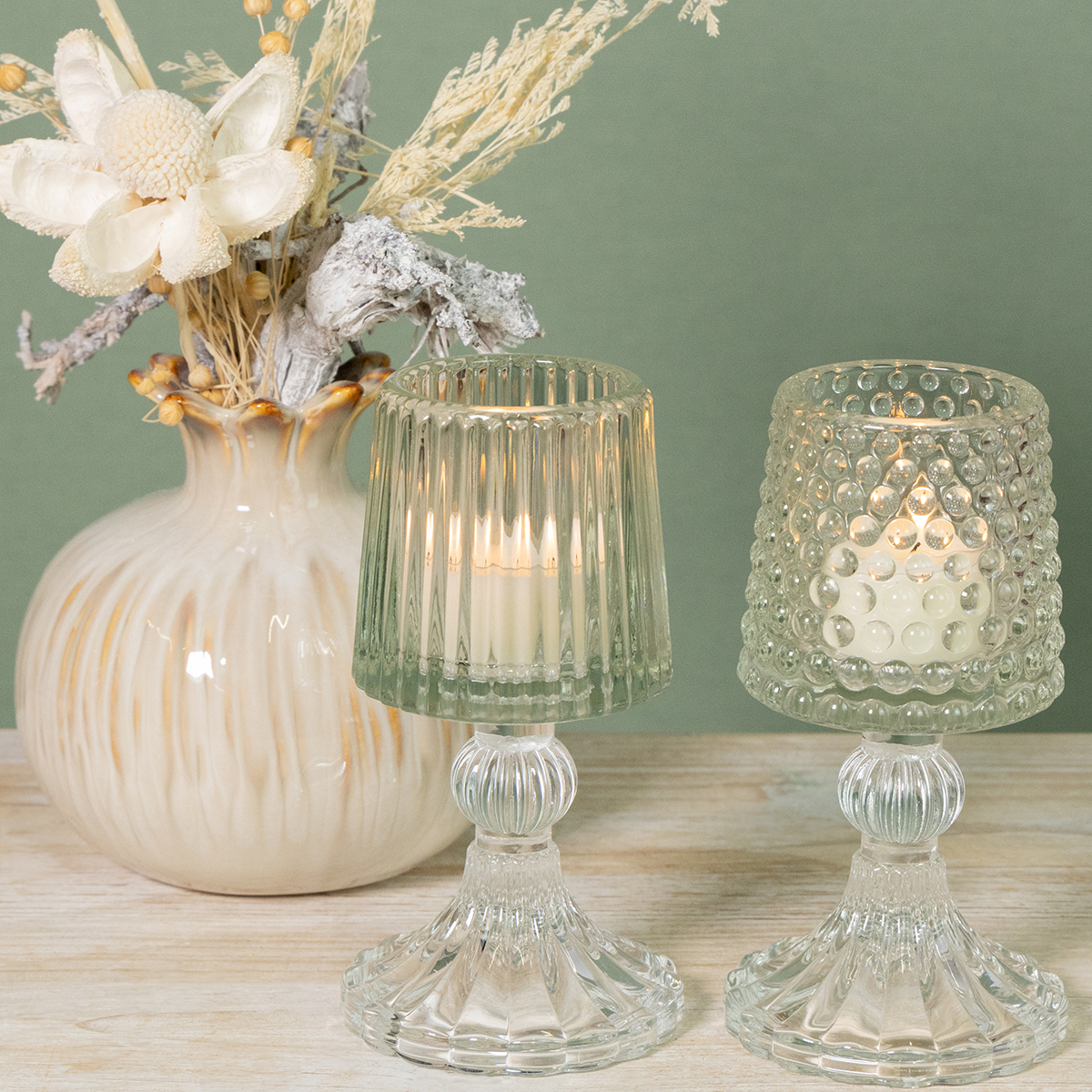 Are you looking for a charming way to enhance your home with a touch of vintage glamour? These glass tealight holders with a base, in an elegant set of two, combine classic beauty with modern functionality. Whether for a romantic evening, a festive table setting, or simply as a stylish addition to your living area, these candle holders are sure to turn heads! The combination of the delicate dots and textured grooves adds a unique touch of sophistication to any room. The textured glass is especially beautiful when lit by candlelight, creating a warm, inviting ambiance.