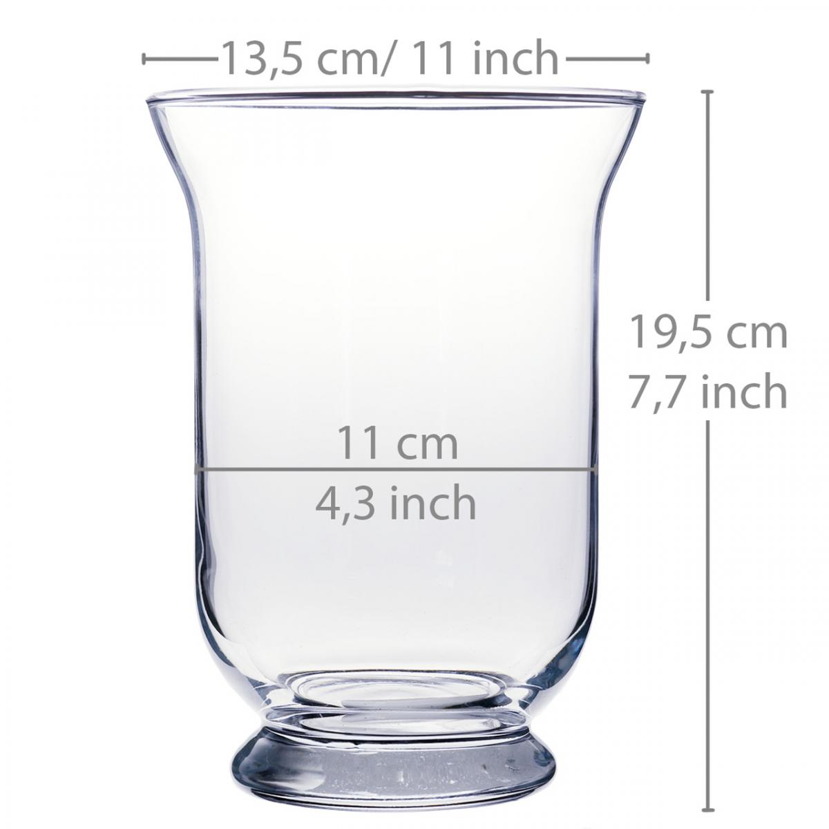 The glass vase is approximately 19.5 centimeters high and has a total diameter of approximately 13.5 centimeters. The opening diameter is about 11 centimeters, while the footprint has a diameter of about 9 centimeters.