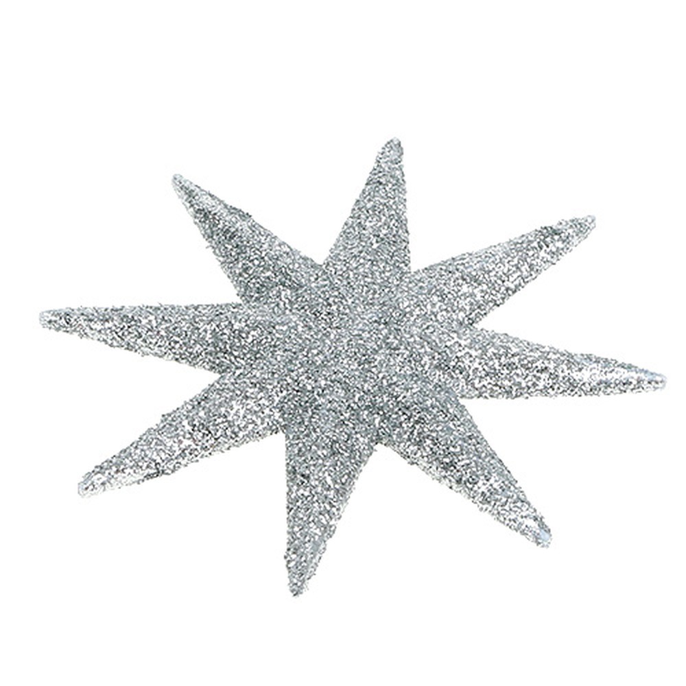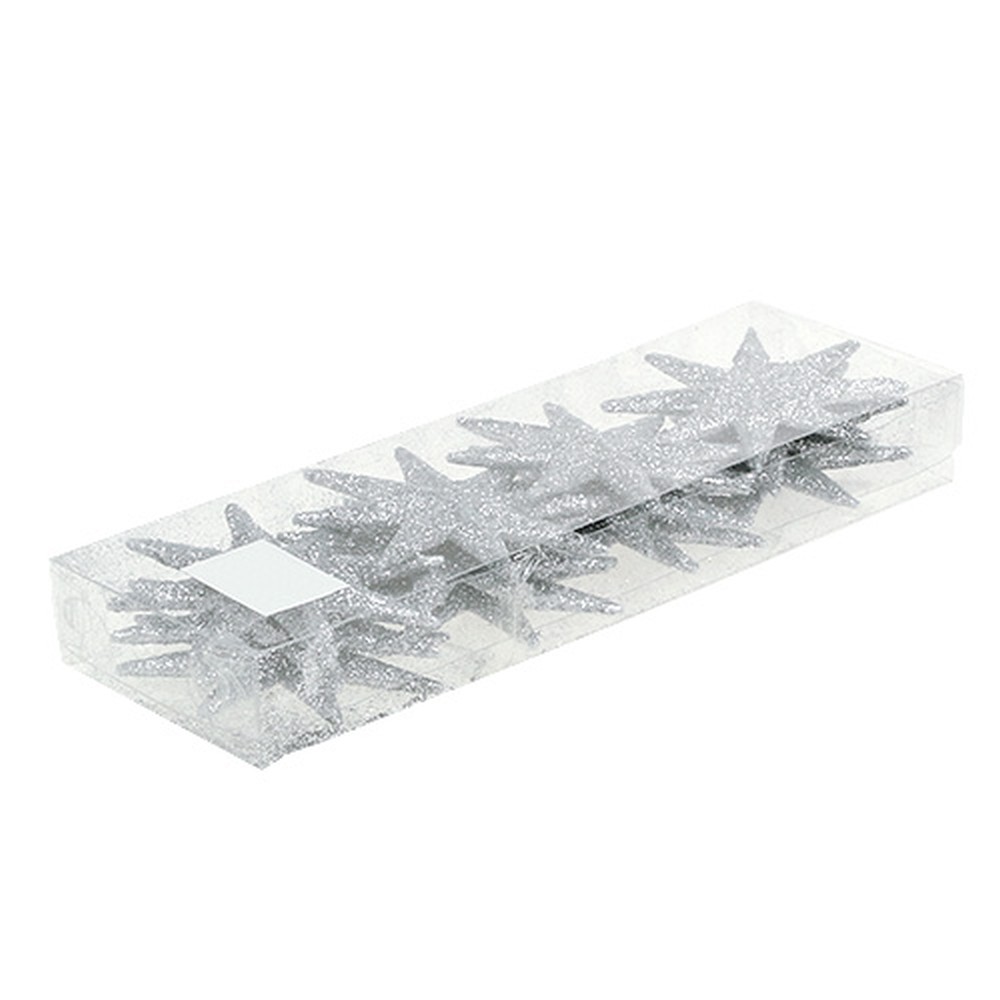 The box supplied contains a total of 12 glitter stars made of silver-colored plastic, each with a diameter of approximately 10 centimeters.