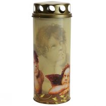 These two elegant grave candles are surrounded by a golden border of rose petals. The lid is also decorated with a floral pattern.