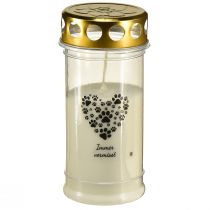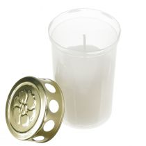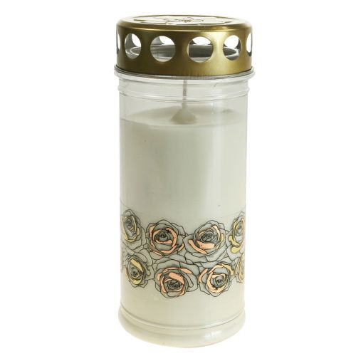 The grave candle is easy to see through the transparent cover. The transparency also ensures that the white wax provides the rose border with a white background. The rose petals are partly filled with gold or are also transparent, so that they shine white and gold in the candlelight.
