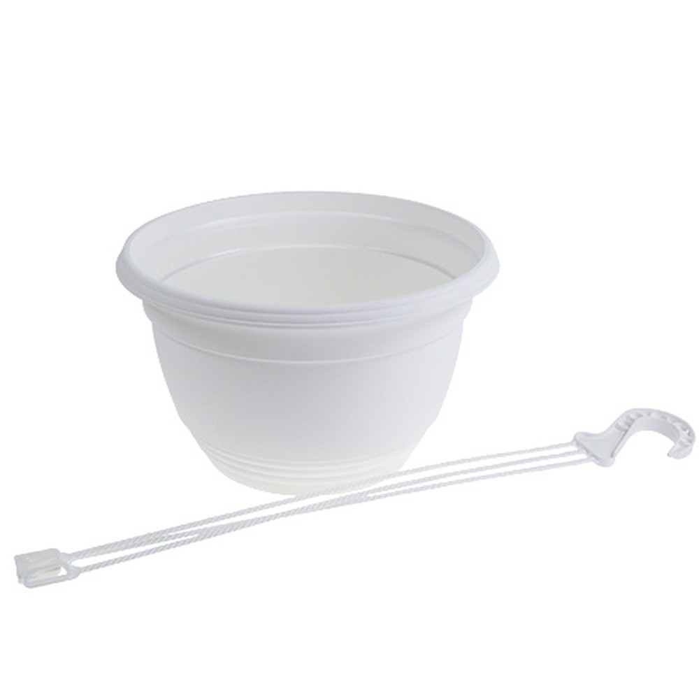 In combination with the hanging hook, the white hanging basket made of weatherproof plastic is around 70 centimeters long. The pot itself has a height of about 18 centimeters, an outside diameter of about 30 centimeters and an inside diameter of about 25 centimeters. The bottom of the planter measures approximately 16.5 centimeters.