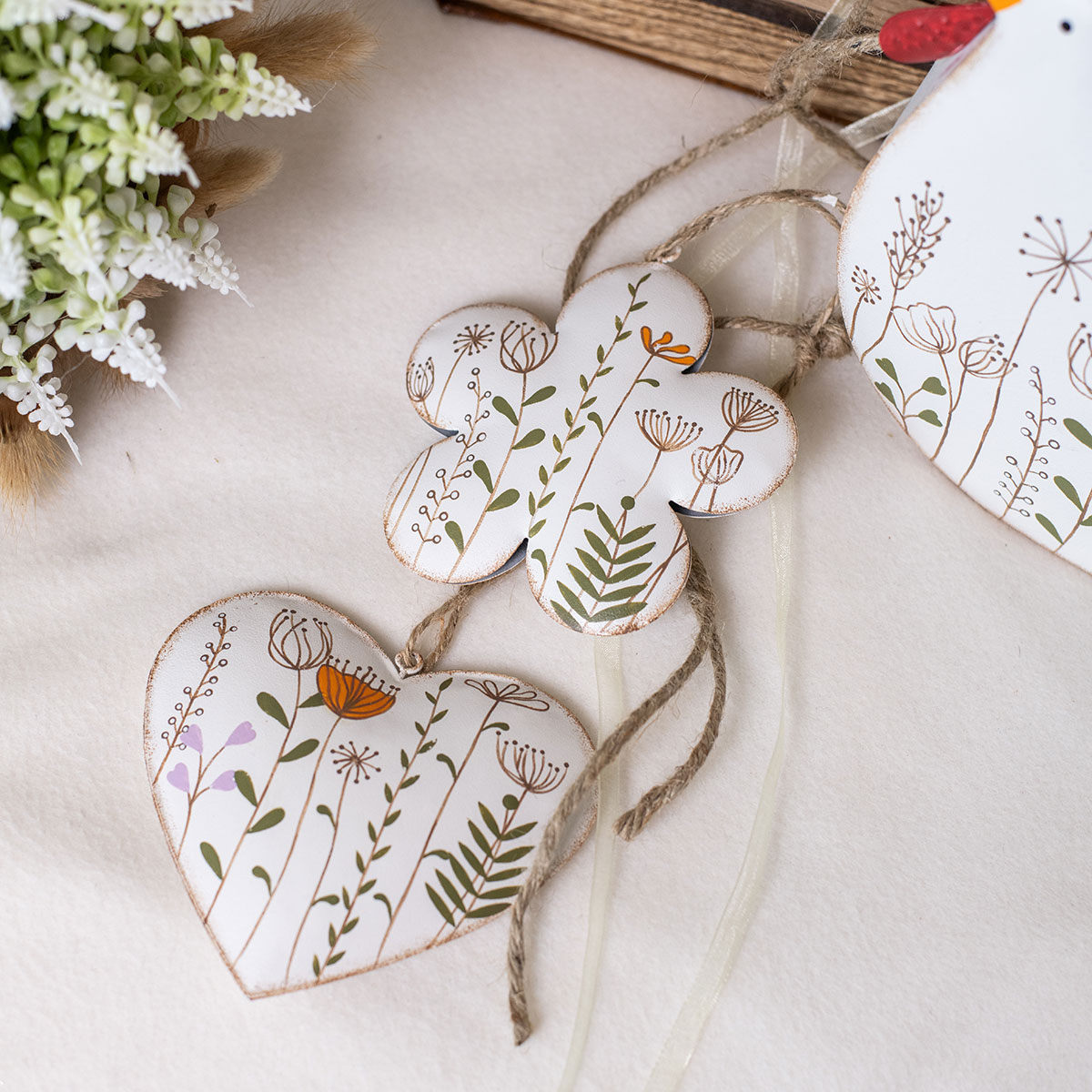 The backs of the decorative hangers are simply white, but are also decorated with rust-colored abrasion marks. The hangers made of natural fiber fit perfectly with this hanging decoration.