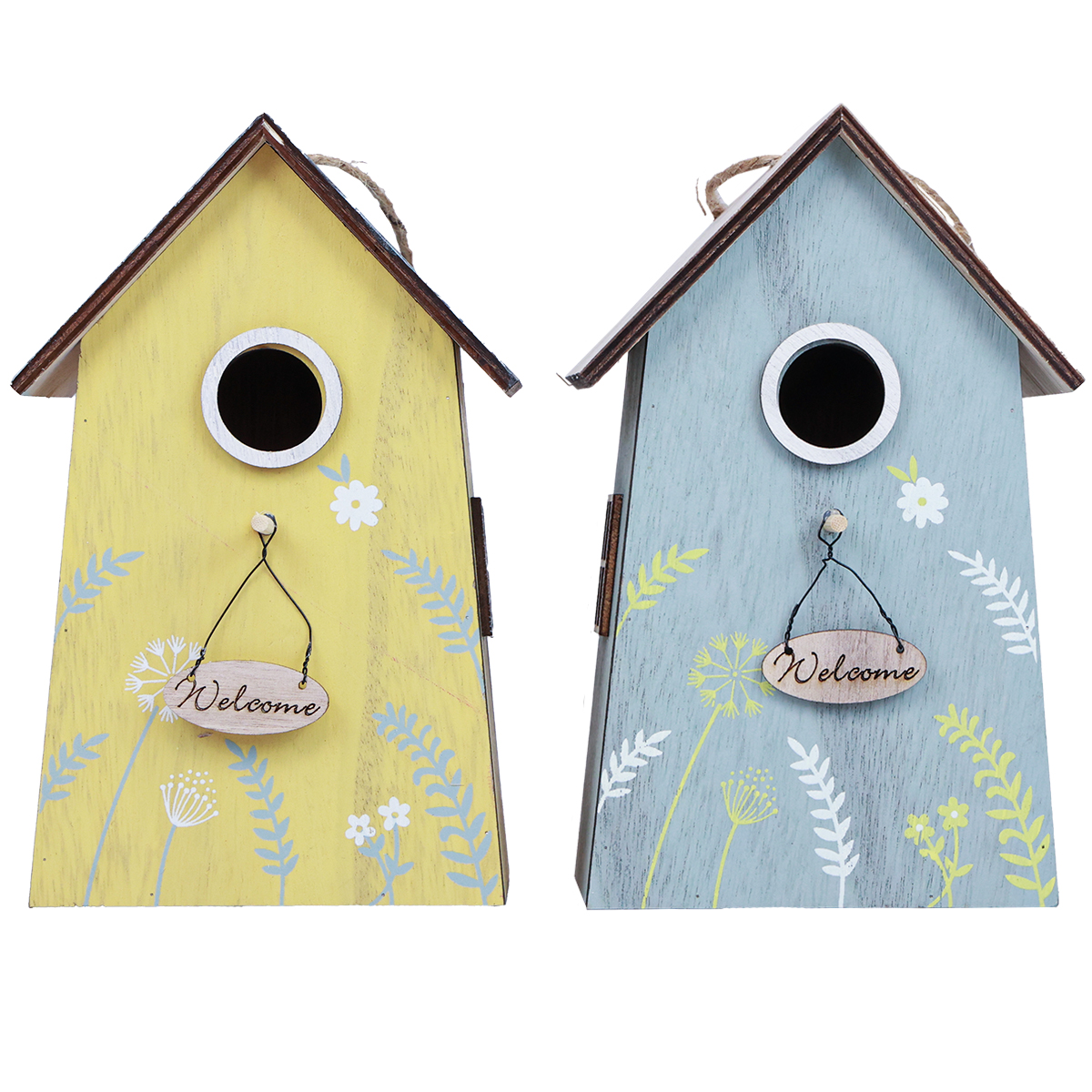 Each of the birdhouses for decorating has a round white framed entry hole with a stick for landing, two windows on the side and a floral print of delicate leaf branches and flower stems in white and green on the front. An oval sign on the landing pole of the bird house decoration completes the inviting look with the inscription “Welcome”.