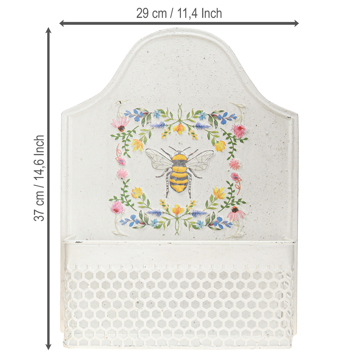 Give your living room or balcony a charming vintage look with our cream-colored hanging metal flower box. This unique decorative piece combines functionality with aesthetic design. The artistic embossing of a bee, framed by colorful flowers, makes this flower box a real eye-catcher. The front of the box features a mesh look, while the back displays the approximately 15 x 15 cm image. This wall decoration is perfect for anyone looking to create a summery atmosphere with a touch of nostalgia.