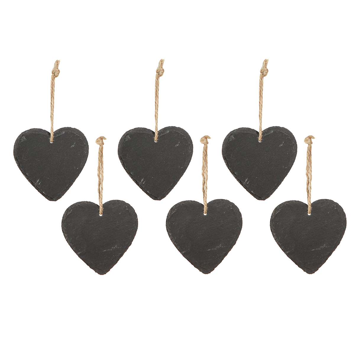 You will receive the hanging slate board in the shape of a heart in a practical pack of 6. The slate heart has a jute cord. The dimensions of the slate heart are approximately 10 centimeters by 9.5 centimeters.