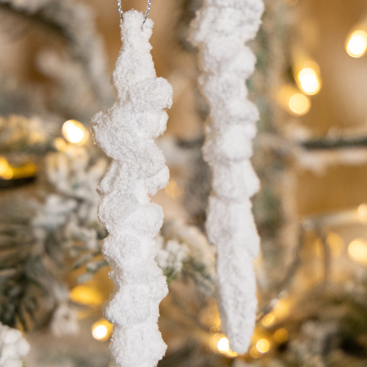 Snow-covered Christmas tree decorations in the shape of icicles – white winter magic for the living room