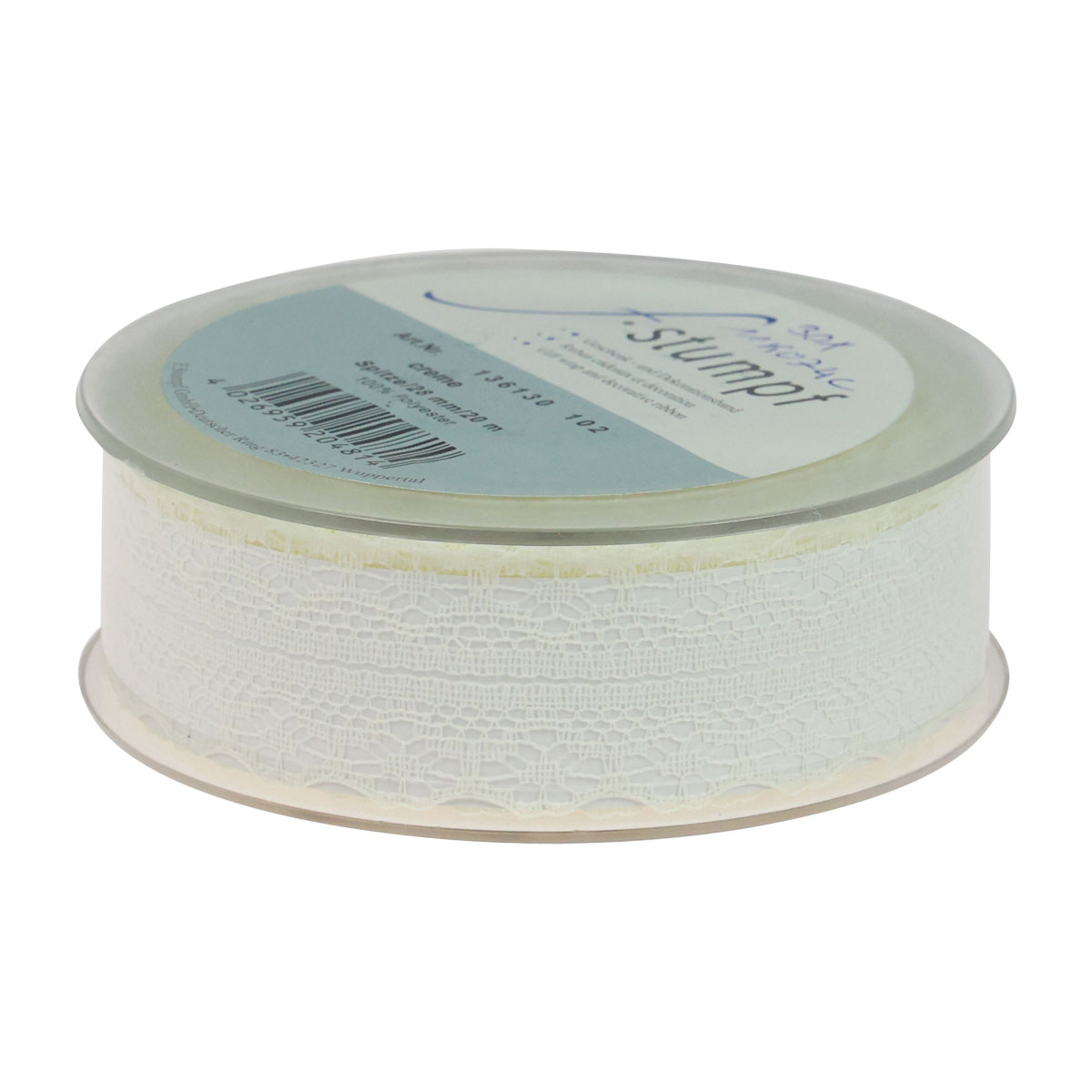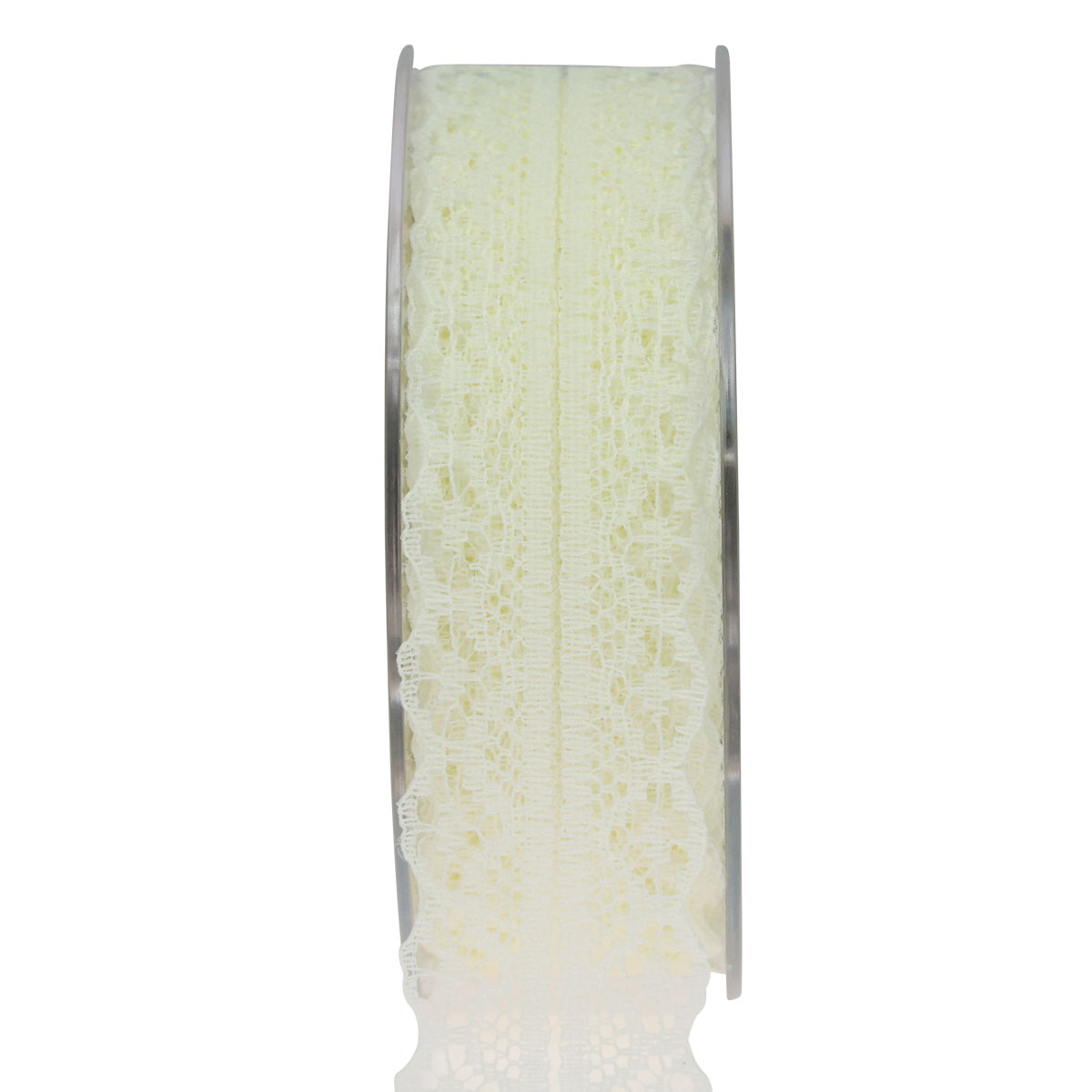 The delicate lace ribbon is around 28 millimeters wide and 20 meters long. The decorative ribbon comes on a practical plastic spool for easy measuring and cutting.