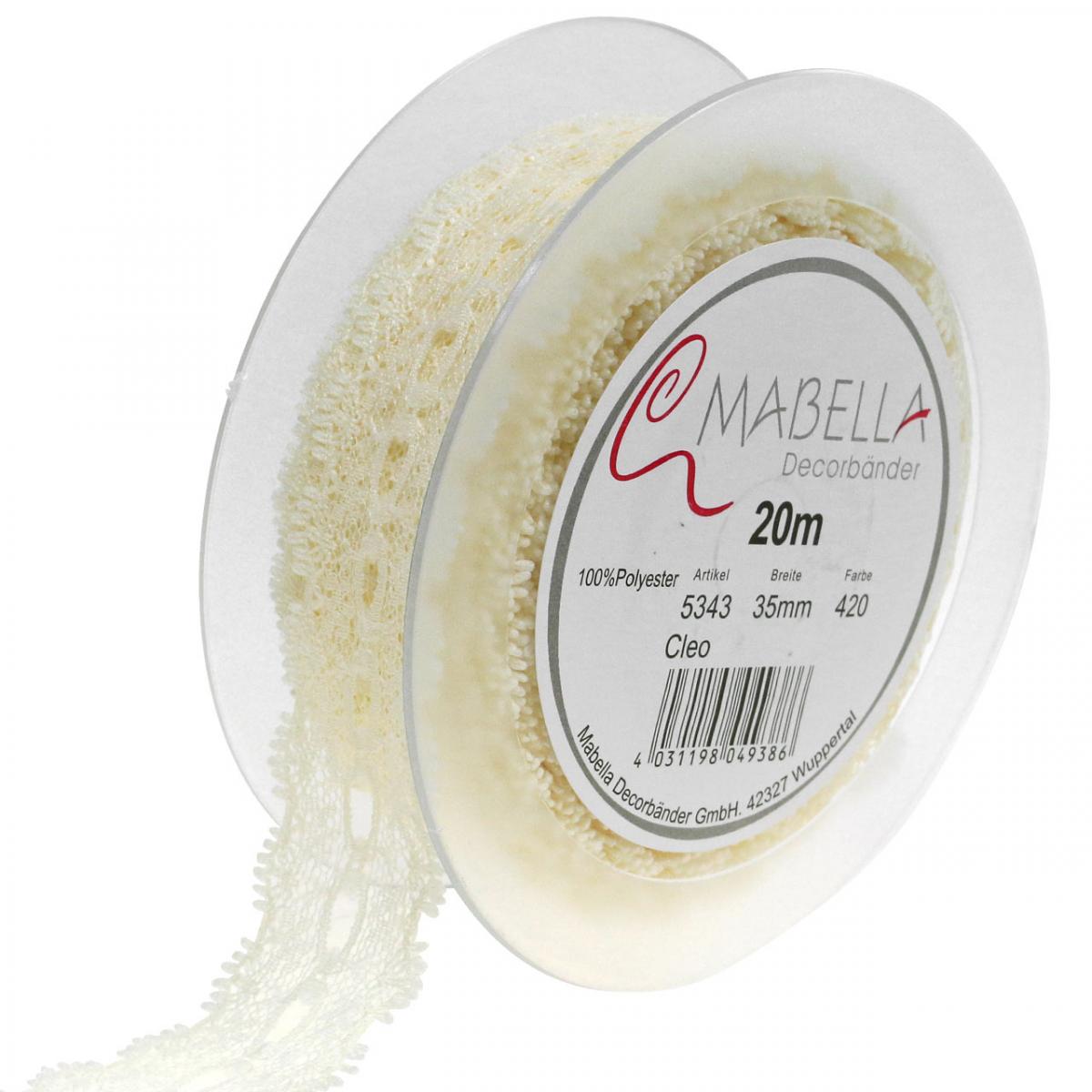 The cream white decorative ribbon is 35 millimeters wide and around 20 meters long. It is delivered rolled up on a practical plastic spool for easy measuring and cutting.