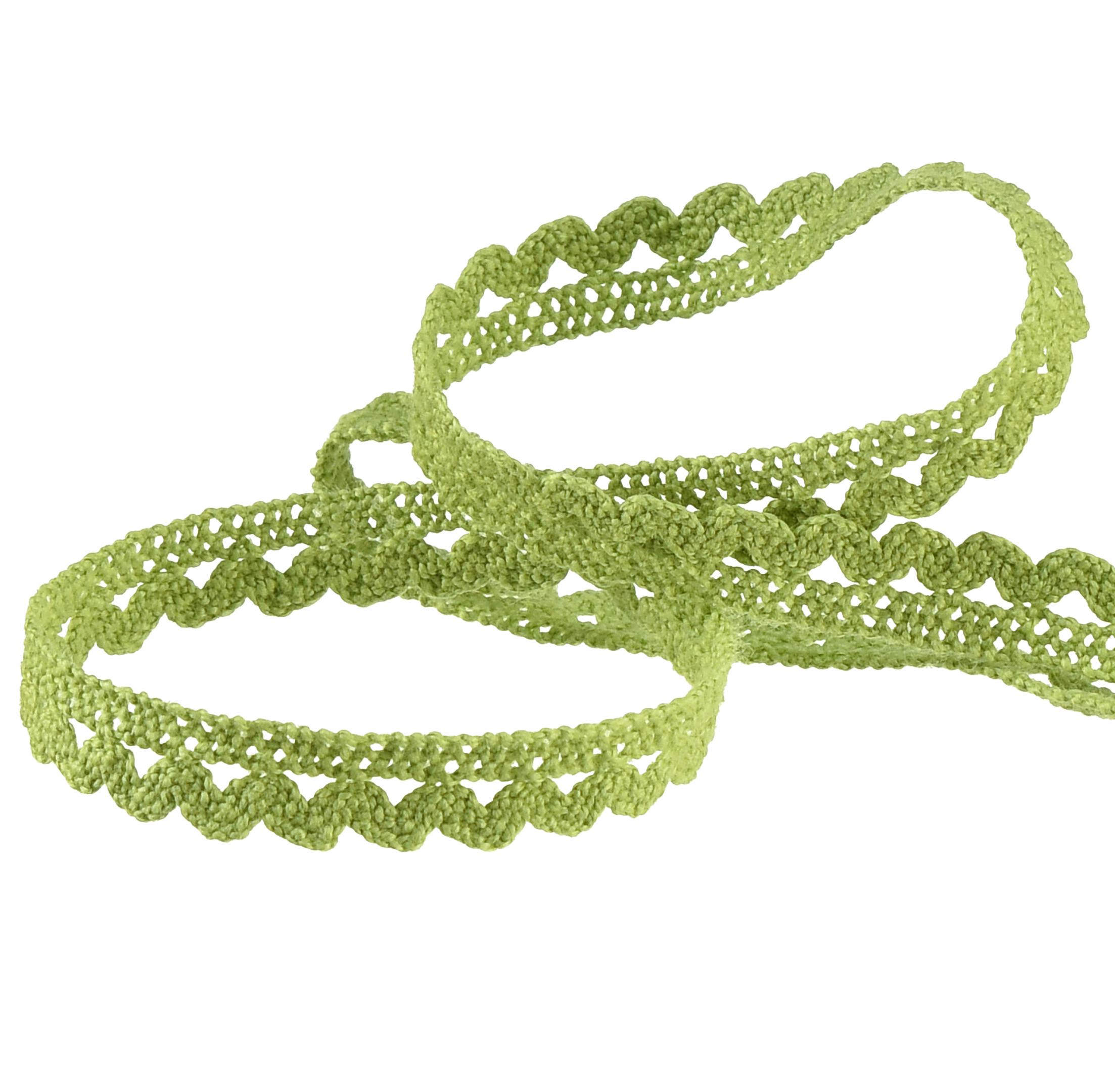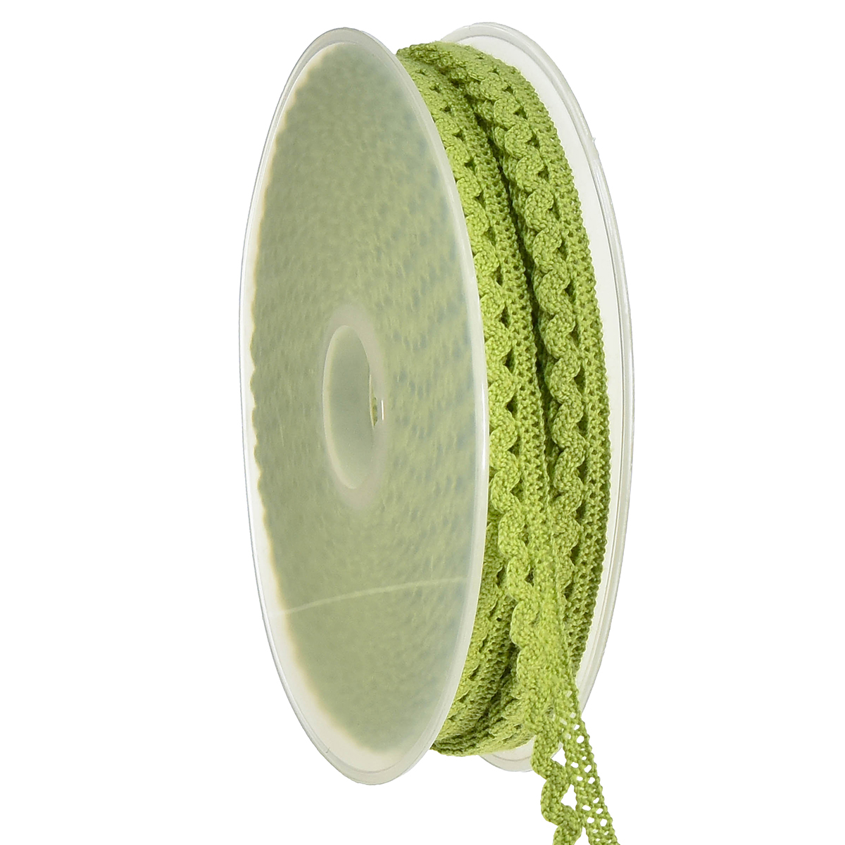The green decorative ribbon with crochet lace measures about 9 millimeters in width and about 20 meters in length. You will receive the decorative ribbon as a roll on a flat plastic spool, where it is pinned with a thin, silver-colored needle.