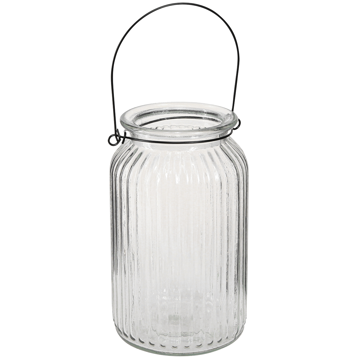 Our hanging lantern features a classic retro design with a modern twist. The robust glass cylinder has a charming grooved look and is reminiscent of a nostalgic preserving jar. Thanks to the black metal bracket, it is not only a visual eye-catcher, but also practical and versatile. Whether indoors or outdoors, this glass lantern gives your decoration that certain something.
