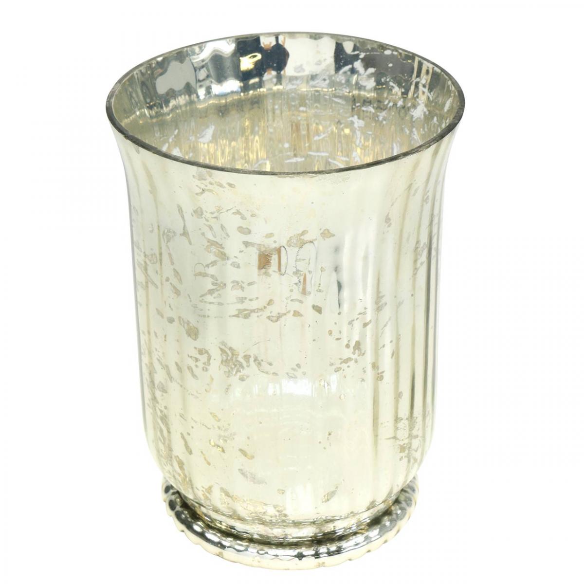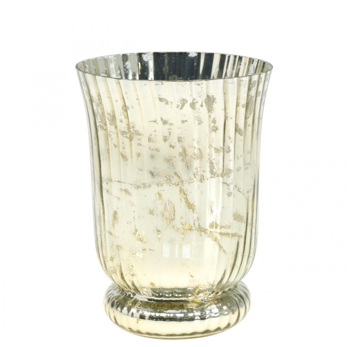 The round tea light glass stands on a foot, has a high conical shape that widens towards the top and a slightly curved wave pattern. The lantern shimmers matt silver on the outside and shiny gold on the inside. The wear and tear on the shiny layer of paint serves to give the lantern a vintage look and also to allow the candlelight to shimmer through the empty spaces. This results in particularly effective and atmospheric lighting.