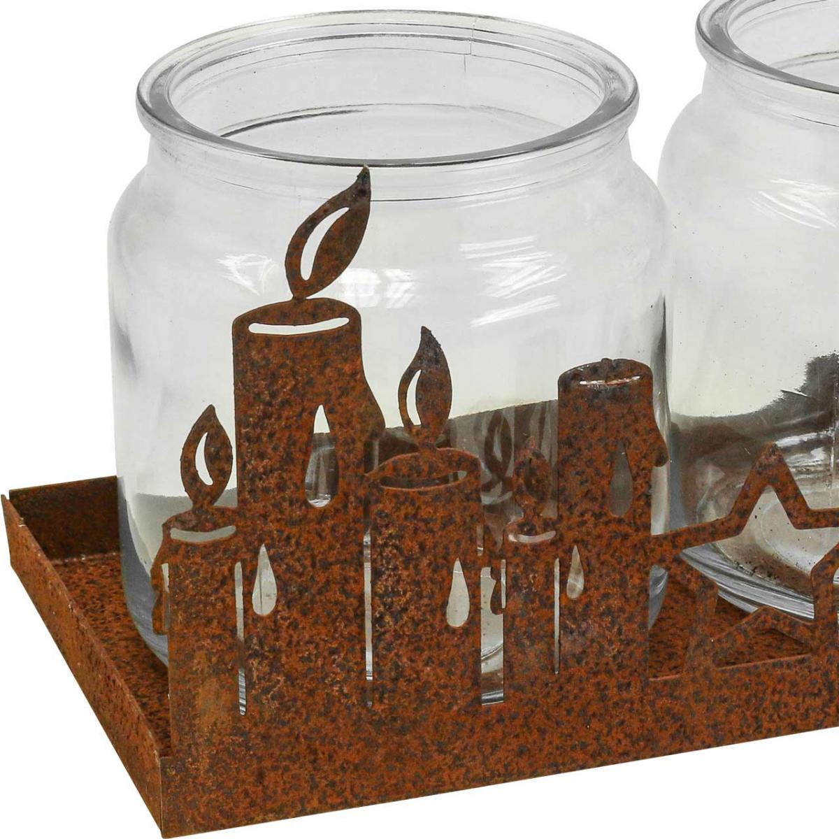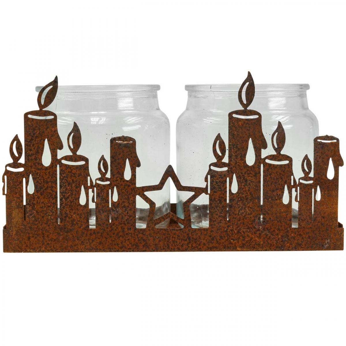 The metal tray on which the two lantern glasses stand has three low edges and a high, decorative silhouette of a candle at the front.