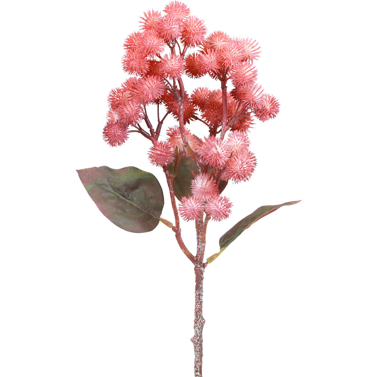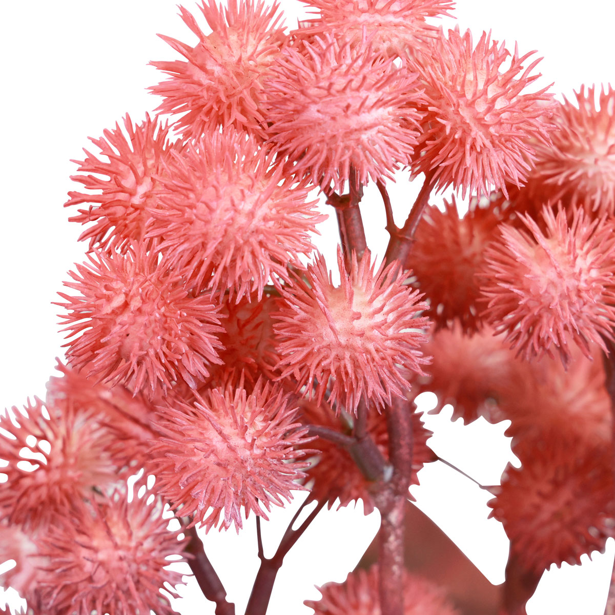 The decorative flower comes with a long red-brown plastic stem that is flexible thanks to the metal core inside, three natural-looking leaves in green-red and a variety of prickly burdock fruits that are red-white to red-yellow.