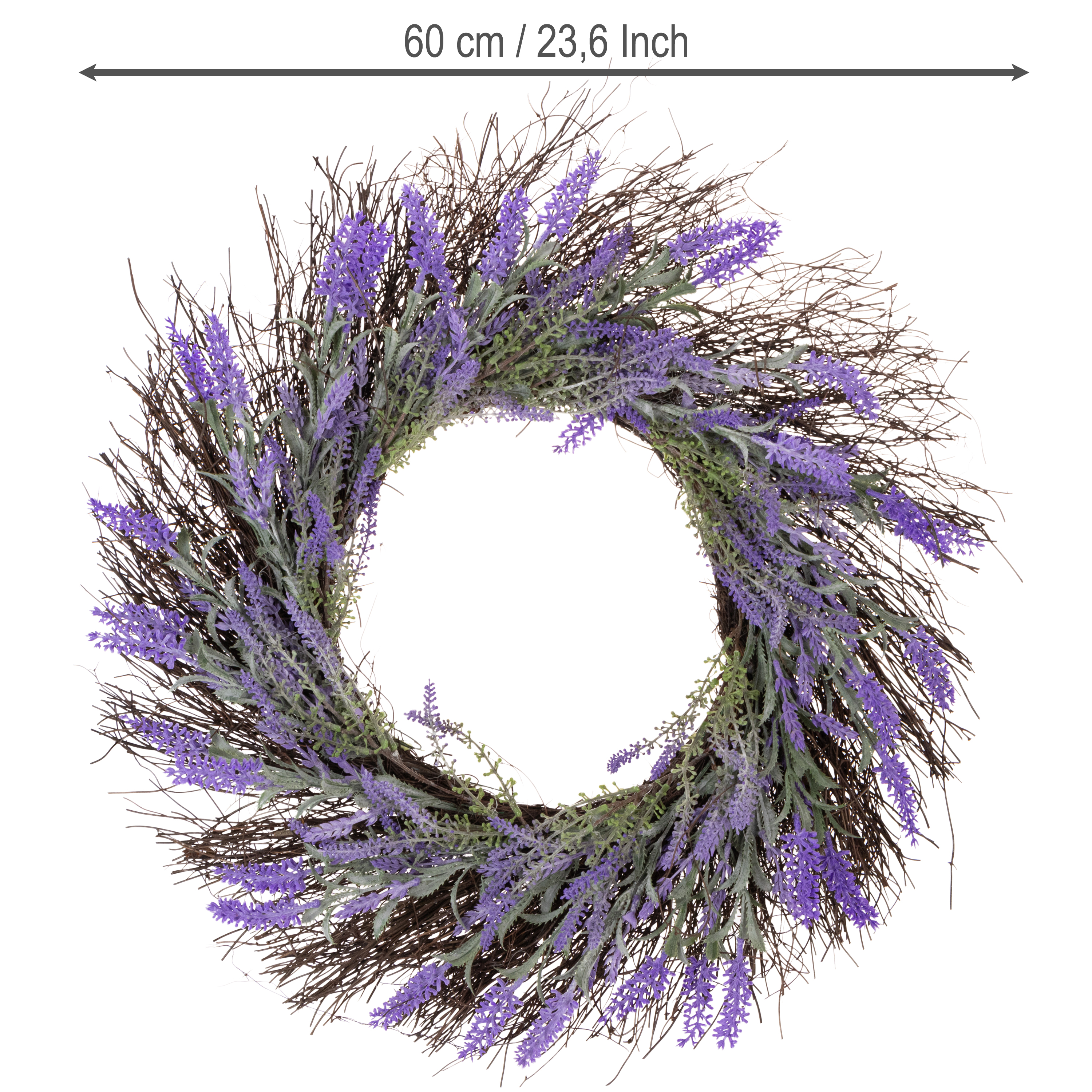 Can you already feel the first warm rays of sunshine and want to decorate your home to match the season? This beautiful lavender wreath will bring spring to any entryway! Lovingly crafted from artificial lavender and real grapevine branches, this decoration is a real eye-catcher and can be used in a variety of ways – from the front door to the living room. With a diameter of 60 centimeters, the lavender wreath brings a touch of spring to any door. Thanks to the sturdy metal ring, the wreath can be easily and securely hung and is perfect for indoor use or sheltered outdoor areas.