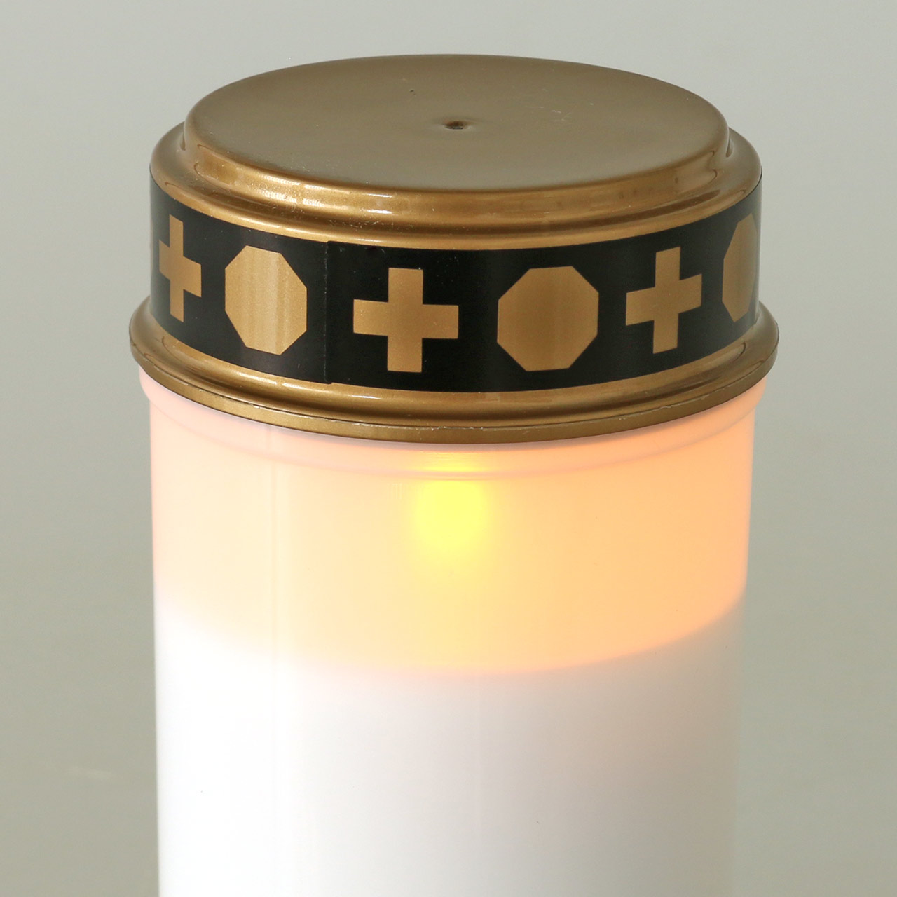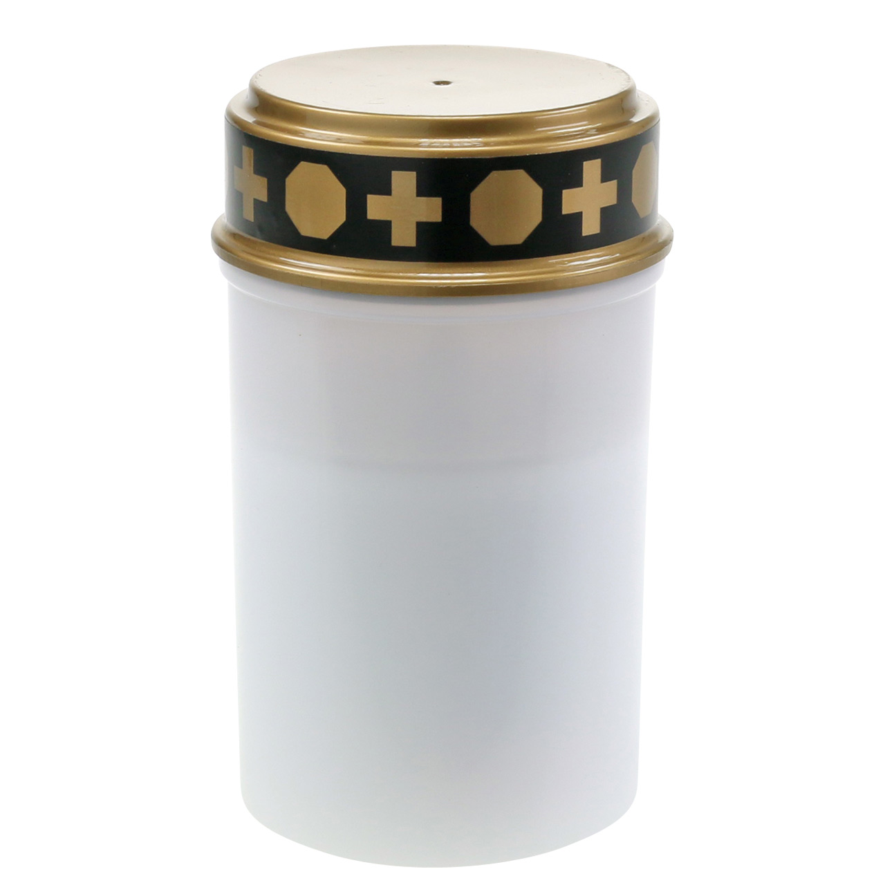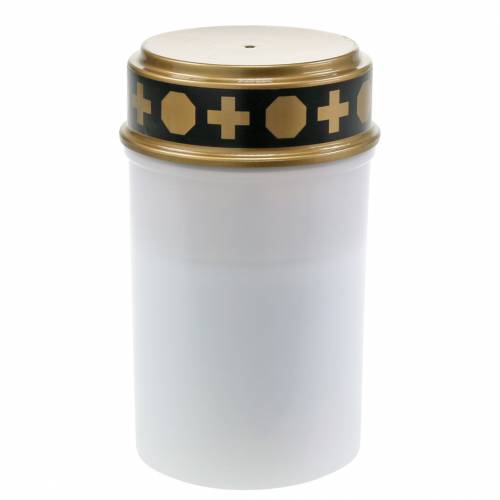 The simple grave light in white has a gold-colored lid. The edge of the LED light is decorated with a black border of crosses and octagons. The grave light looks like a normal grave candle. But it is not a wax candle. A long-lasting LED candle is embedded in the shell of the white LED tea light. Its light burns almost like that of a real candle and shines through the semi-transparent white envelope.