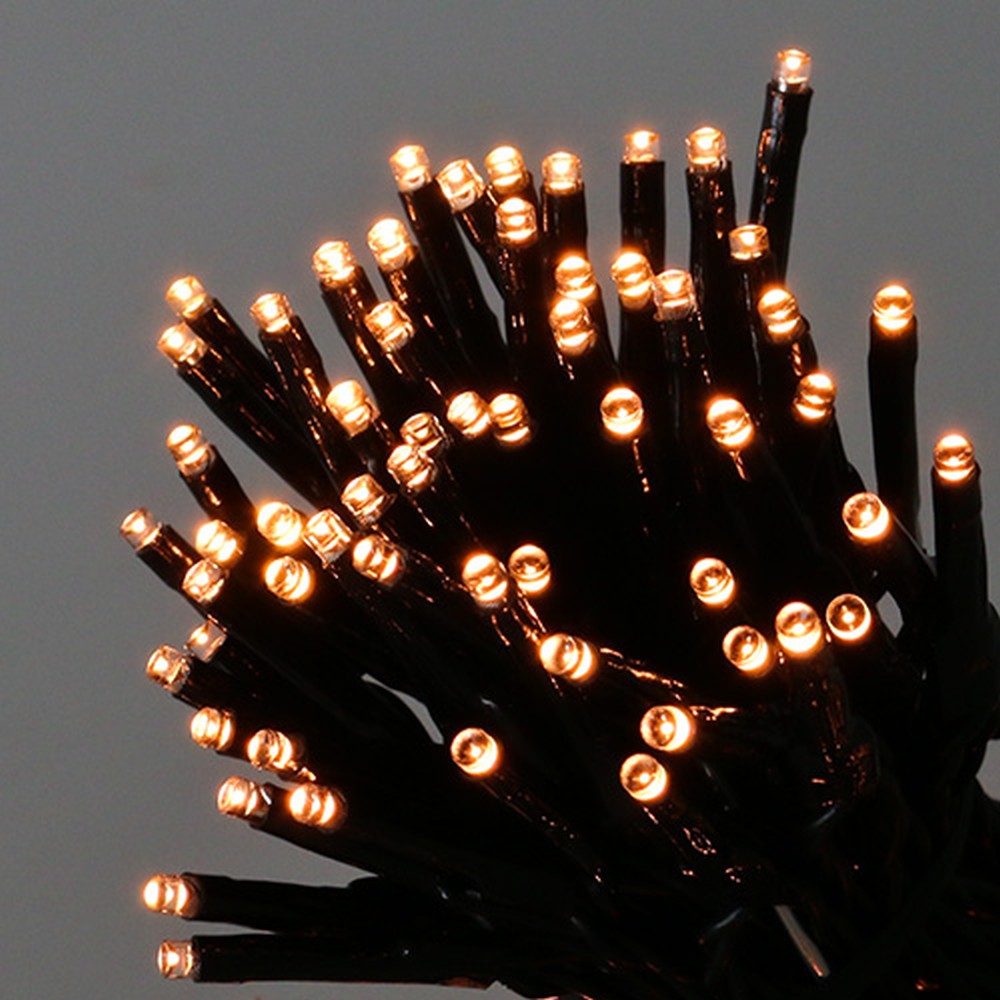 The LED rice light chain for outdoors in warm white has 80 lamps on the string and is around 6 meters long. With the supply cable of around 3 meters, the light chain has a total cable length of 9 meters. The distance between the individual lamps is around 7.5 centimeters.