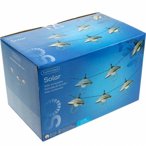 Decorate your balcony or terrace with the solar light chain and bring retro charm and a cozy camping atmosphere into your home! There are a total of six lamps on the string of lights. Each lamp has a silver-colored protective canopy and a decorative protective grille. The LED lamps are connected to one another by wire and each has a large hook on the top for attachment to the balcony ceiling using S-hooks or straps.