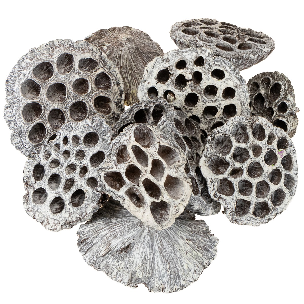 The medium-sized and frosted lotus from nature comes in a bag with a total of 50 pieces. The seed capsules are natural products that can differ slightly from one another and all have different dimensions.