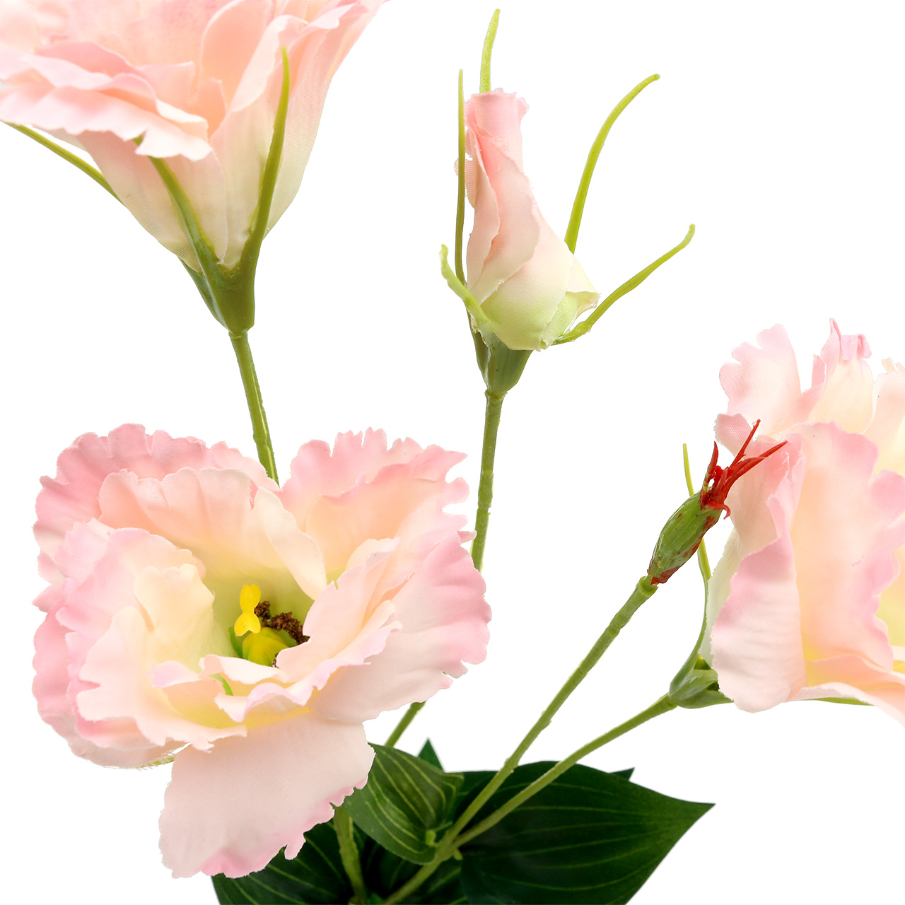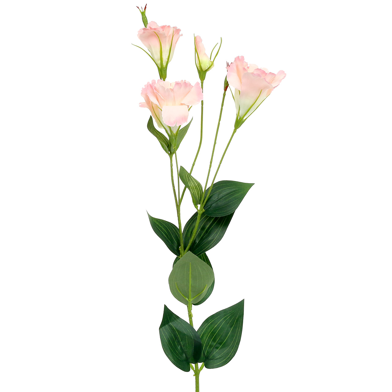 The artificial, pink lisianthus branch measures around 87.5 centimeters in length, while the individual flowers - with the exception of the bud - are between 7.5 and 9 centimeters in size.