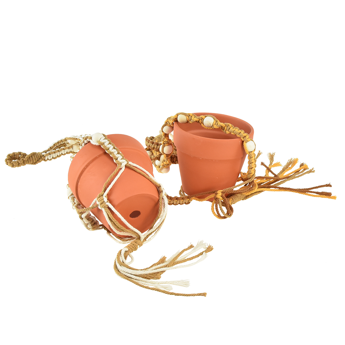 You will receive the hanging pot with macrame suspension in sets of 2, sorted by the colors of the knotted ropes and differentiated by the hanger. One suspension consists mainly of beige and white cotton threads and has a wooden ring as a hanger, while the other is brown and yellow and is tied into a loop at the end.