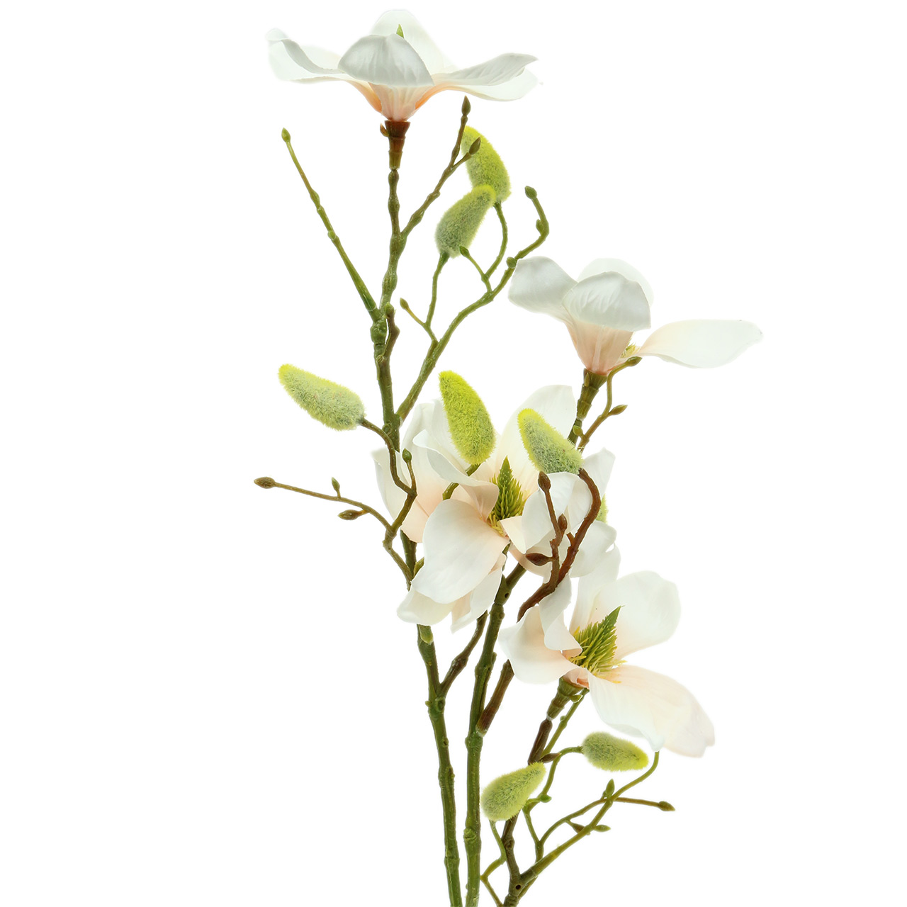 The artificial magnolia in the color peach is about 85 centimeters long, with the flowers about 10 centimeters in diameter. A wire core made of metal makes processing easier.